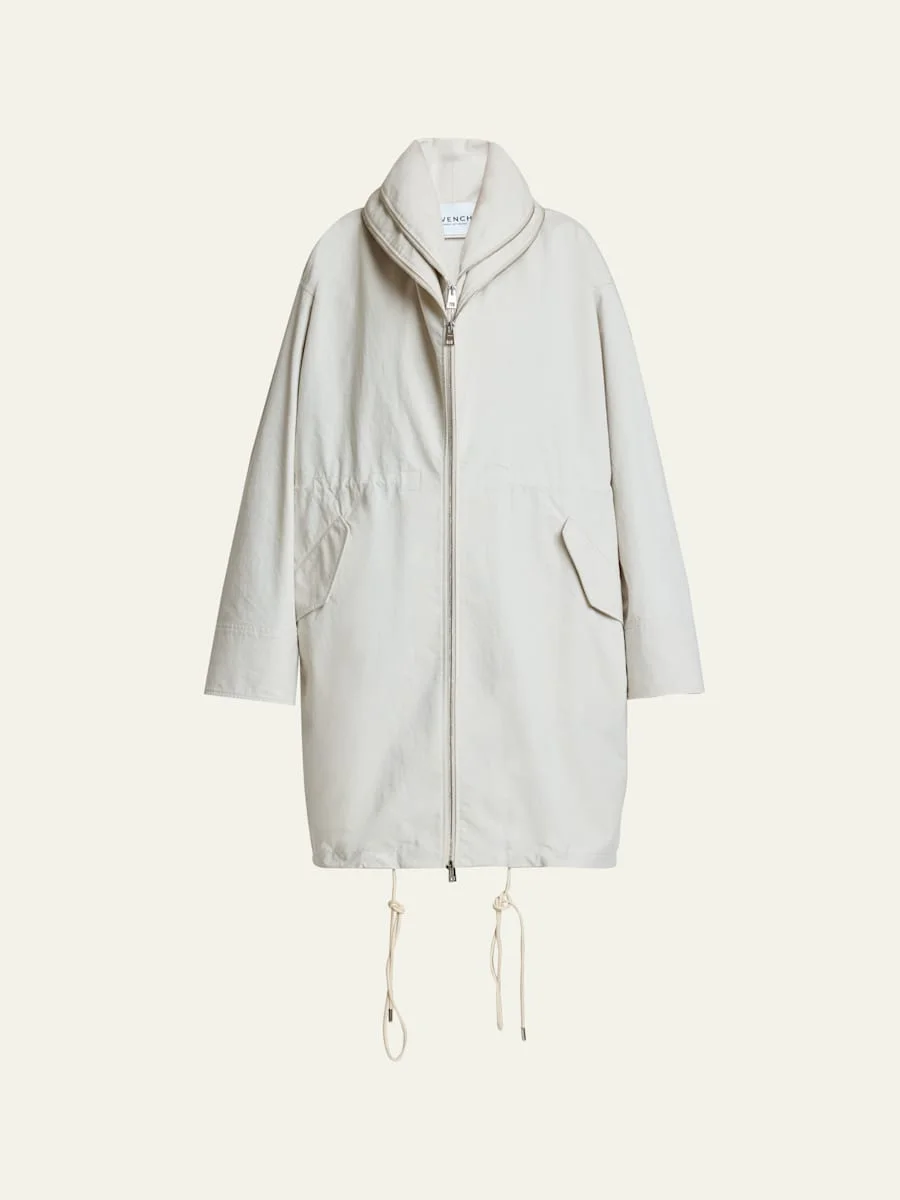 Crafted from technical cotton canvas, this Givenchy jacket features a double collar detail with infinity zippers and a drawstring split hem Shawl collar; twoway zip front Long sleeves Inner drawstring cinched waist Hip flap pockets Oversized fit Knee length Drawstring hem Cotton/nylon/polyamide Made in Italy