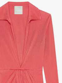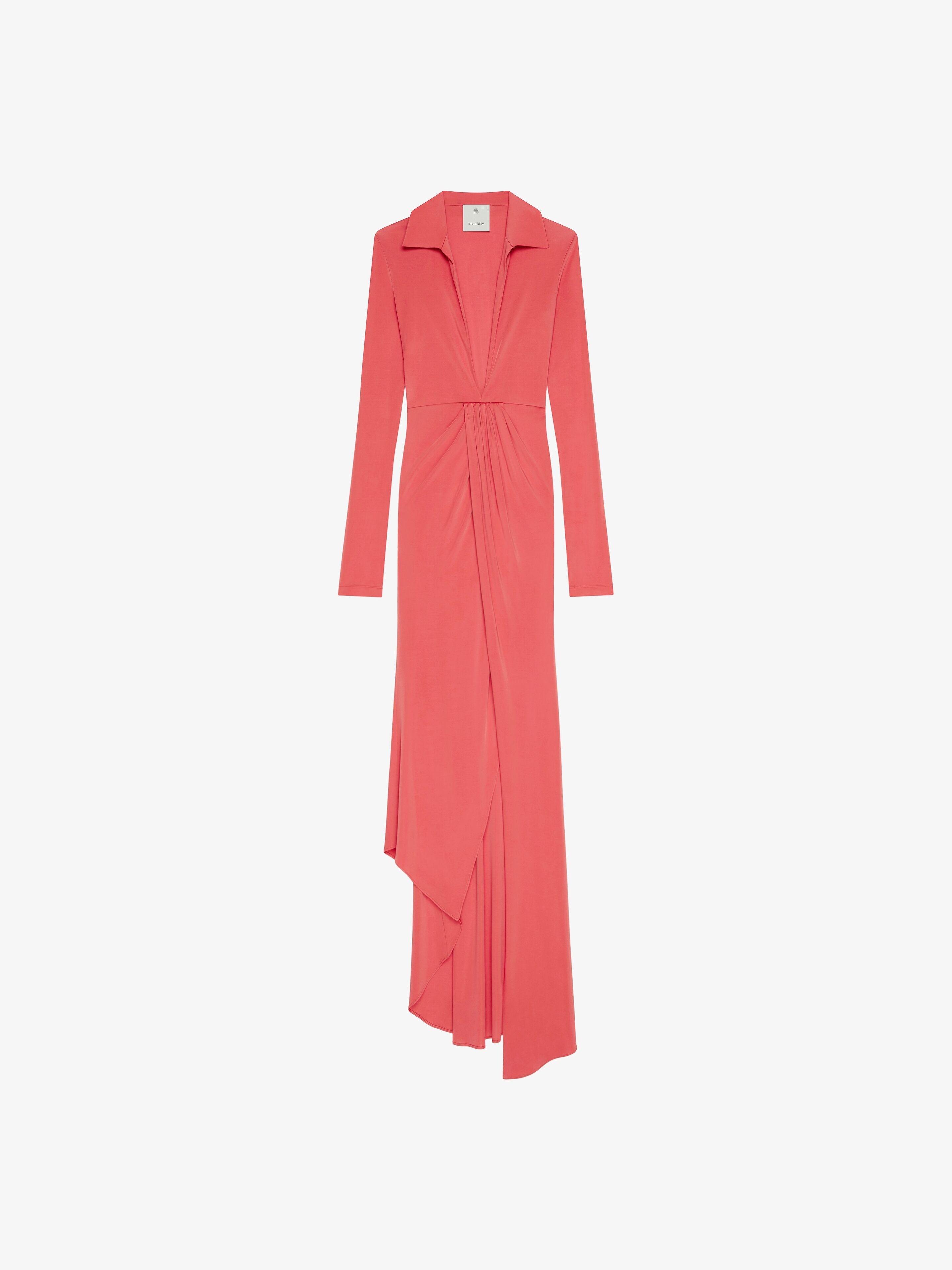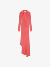 - Long dress with long sleeves in fluid jersey. - Shirt collar with plunging V neck. - Invisible zipped closure on the side. - Asymmetric fluid skirt. - Model measures 5.8 Feet and wears a size 36.