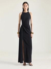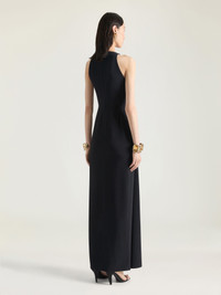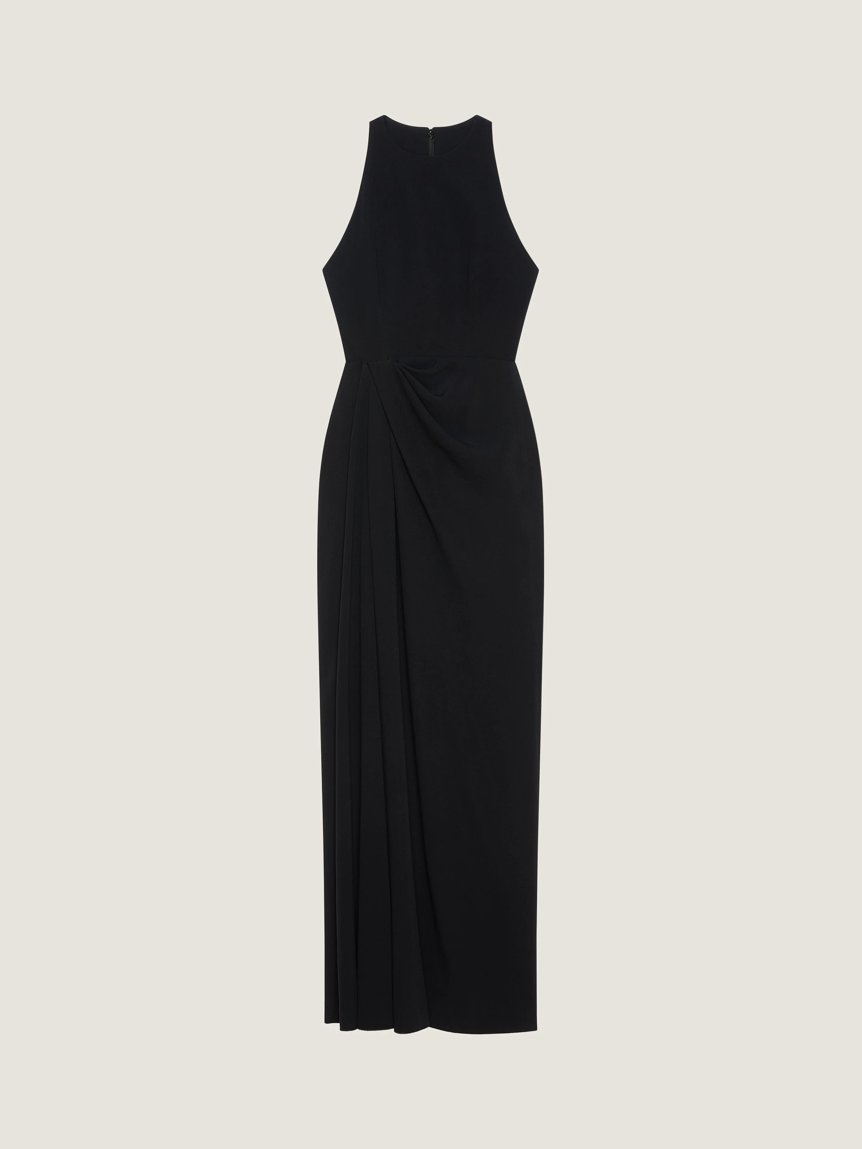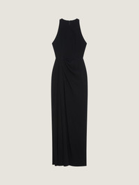 - Long sleeveless evening dress in crepe cady. - Halter neck. - Draped. - Sliced slash detailing on the front. - Invisible zipped closure on the back. - Model measures 5.8 Feet and wears a size 36.