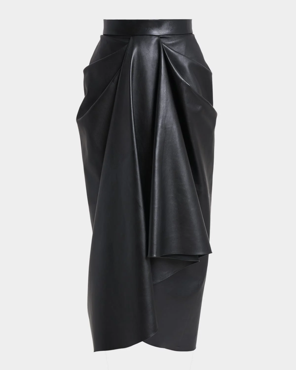 Givenchy skirt is crafted from supple lambskin leather accented with front draping & nbsp; High waist Skirt falls straight from hip to hem Hem falls below the knee Invisible back zip Leather Lining: Acetate/silk Made in Italy