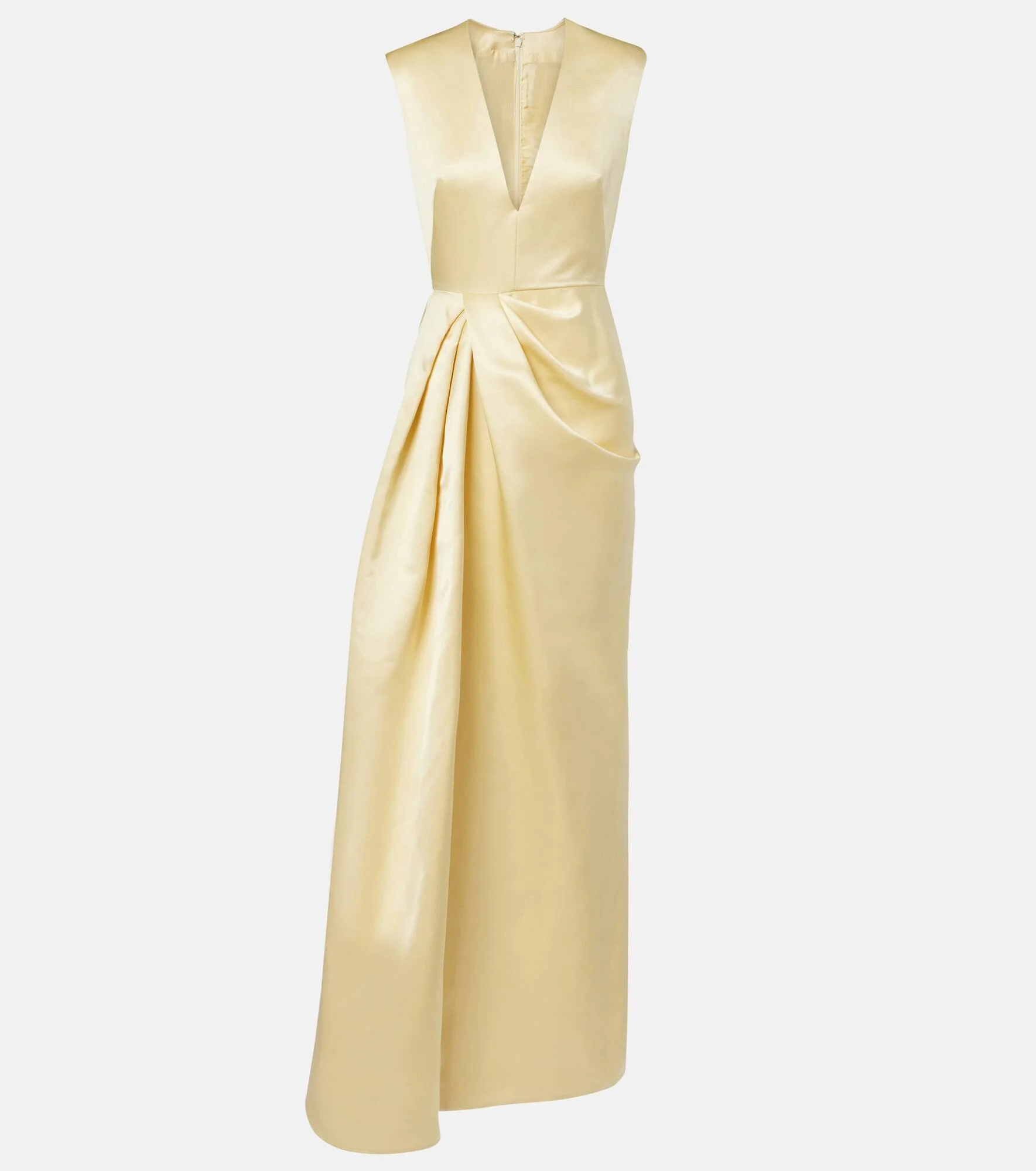 This draped gown recalls the timeless, glamorous dresses that made Givenchy famous when it first launched in the 1950s. The design features a high front slit and is made from lustrous silk satin. Product Details - Material: 100% silk - Care instructions: dry clean - Made in Italy - Designer color name: Butter - Item color: yellow - Collar: V-neck - Closure: concealed zipper, zipped back, hook-fastening back - Long vent - Item number: P01081189
