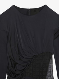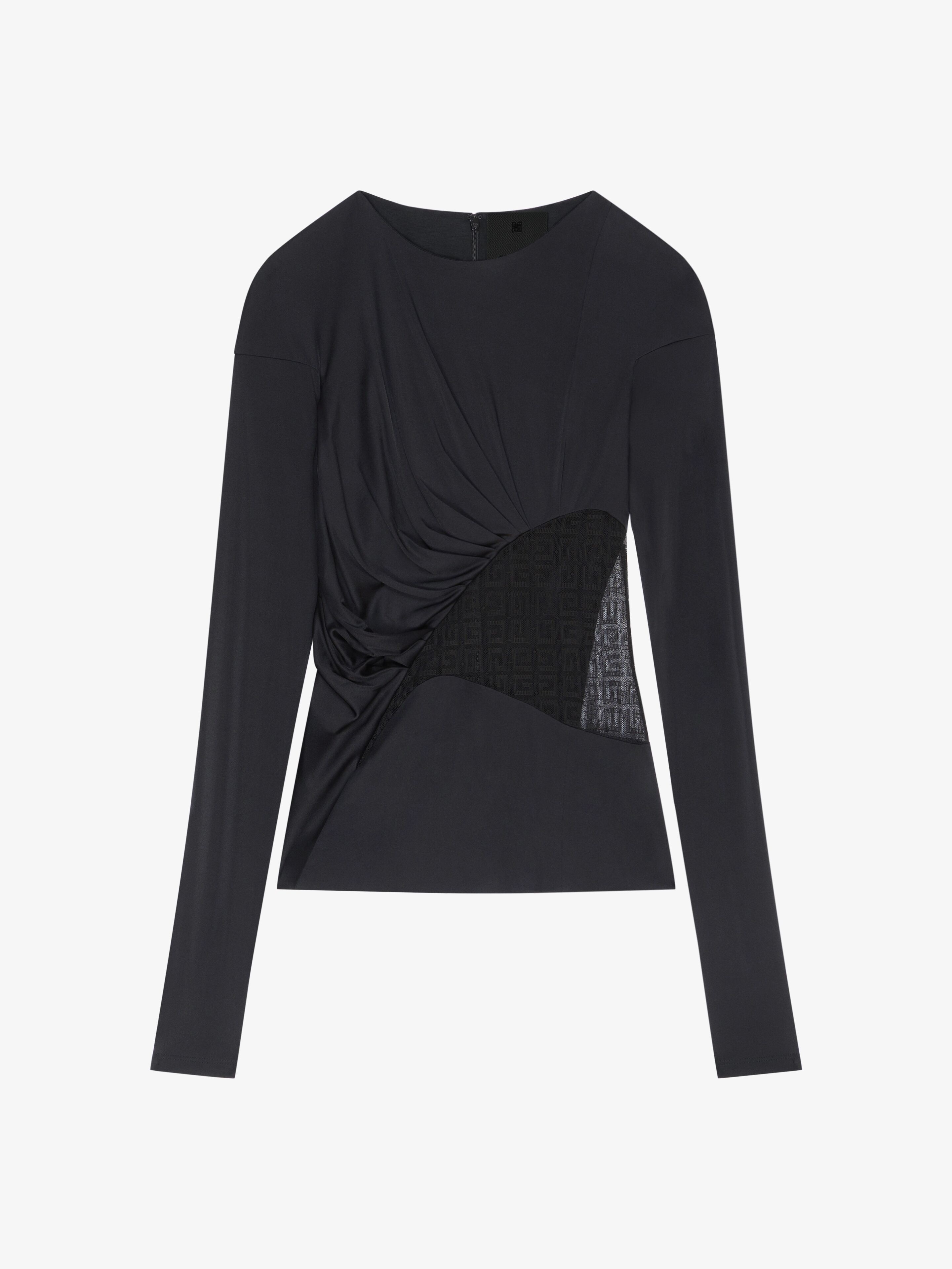 - Long-sleeved top in fluid jersey. - Asymmetrical lace inlays with all over 4G pattern. - Crew neck. - Draped on the side. - Invisible zipped closure on the back. - Model measures 69.7 in and wears a size 36.