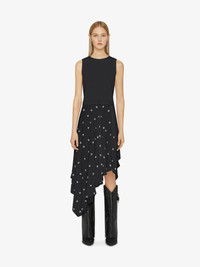 - Sleeveless dress with jersey top and with asymmetrical ruffled skirt in silk with 4G plumetis in lurex thread on the front. - Crew neck. - Elastic band on the waist with embroidered 4G emblem on the front and GIVENCHY signature on the back. - Hidden metal zipper on the side of the skirt.
