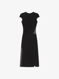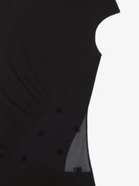 - Short dress with short sleeves in crepe viscose. - 4G velvet flock effect. - 4G plumetis asymmetrical transparent tulle inlays. - Crew neck. - Draped effect on the side. - Slit in the front. - Invisible zipped closure on the back.