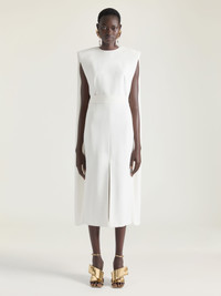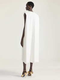 - Cape back midi sleeveless dress in crepe cady. - Crew neck. - Cinched at the waist. - Invisible zipped closure on the back. - Front slit. - Model measures 5.8 Feet and wears a size 36.