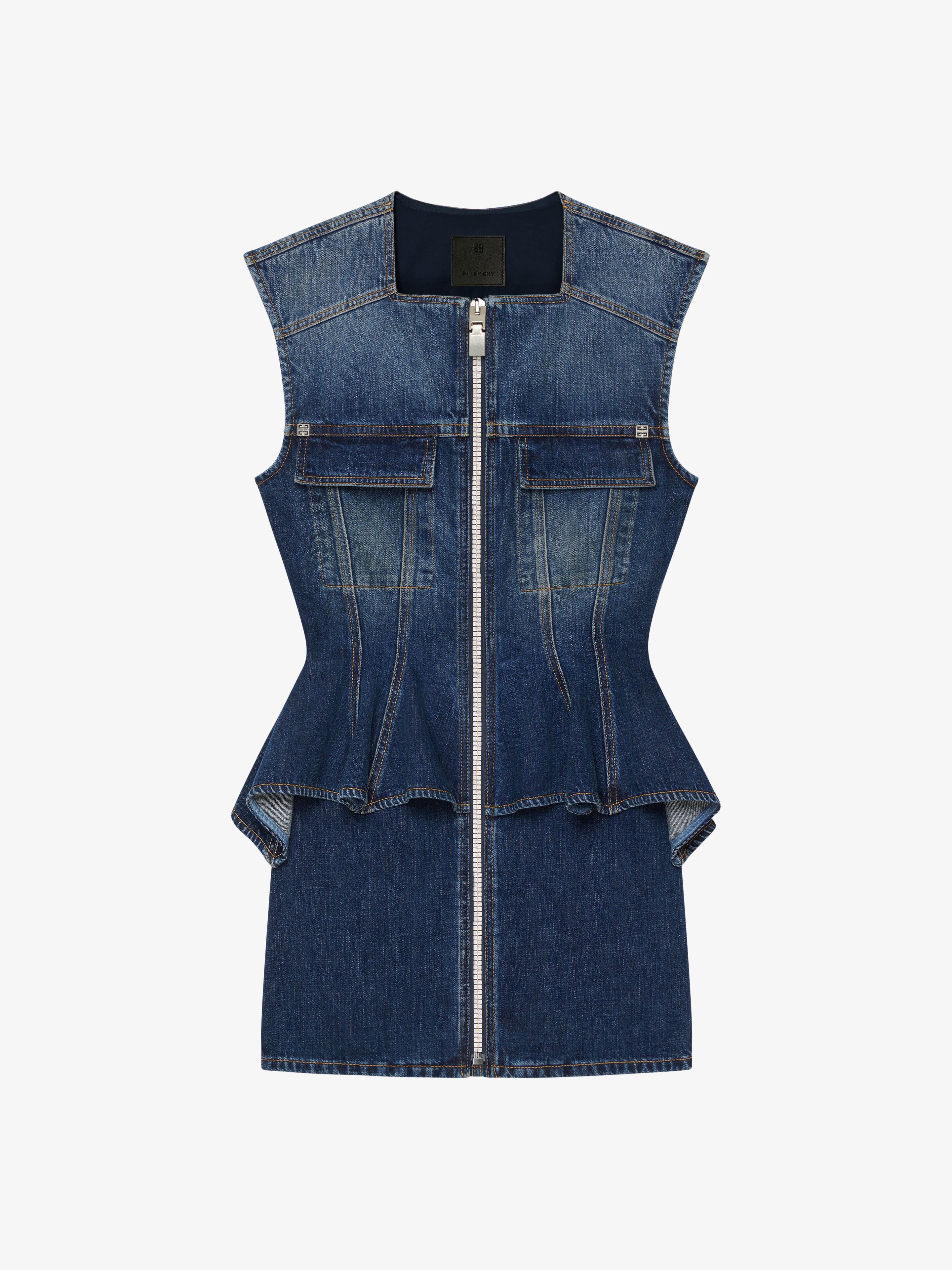- Short sleeveless dress in vintage denim. - Color: medium blue. - 4G metal zipper closure with GIVENCHY 4G zipper pull on the front. - Square neckline. - Two flap pockets on the chest with 4G metal rivets. - Tailored fit with overlaid-effect basques at the waist.