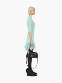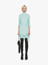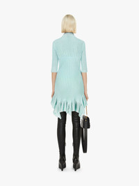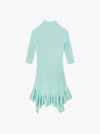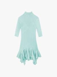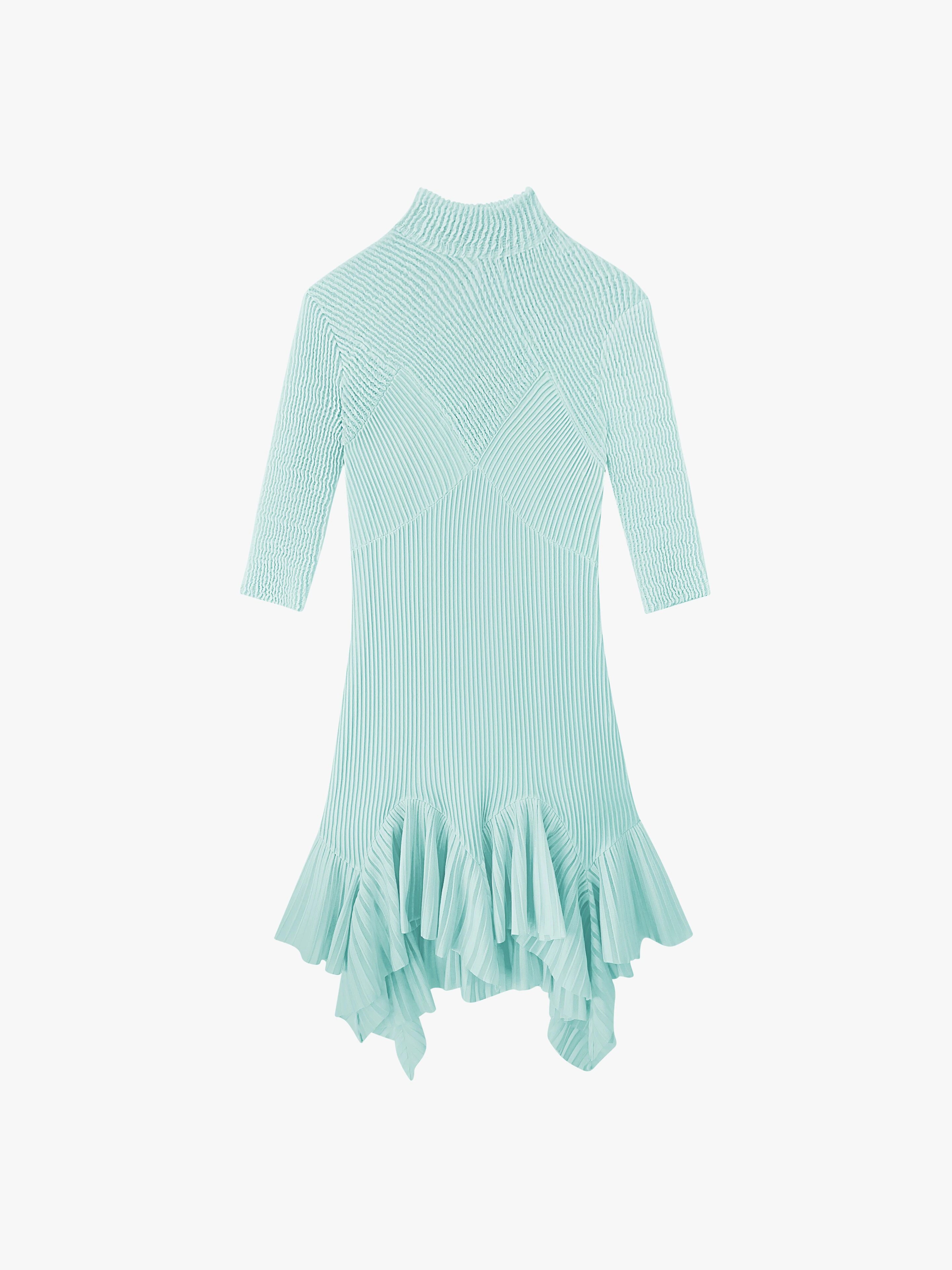 - Three-quarter-sleeved short dress in transparent viscose knit blend. - High-neck collar. - Graphic structured bust. - Overlaid ruffles on the hem. - Invisible zipper at the collar. - Longer in the back.