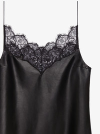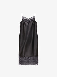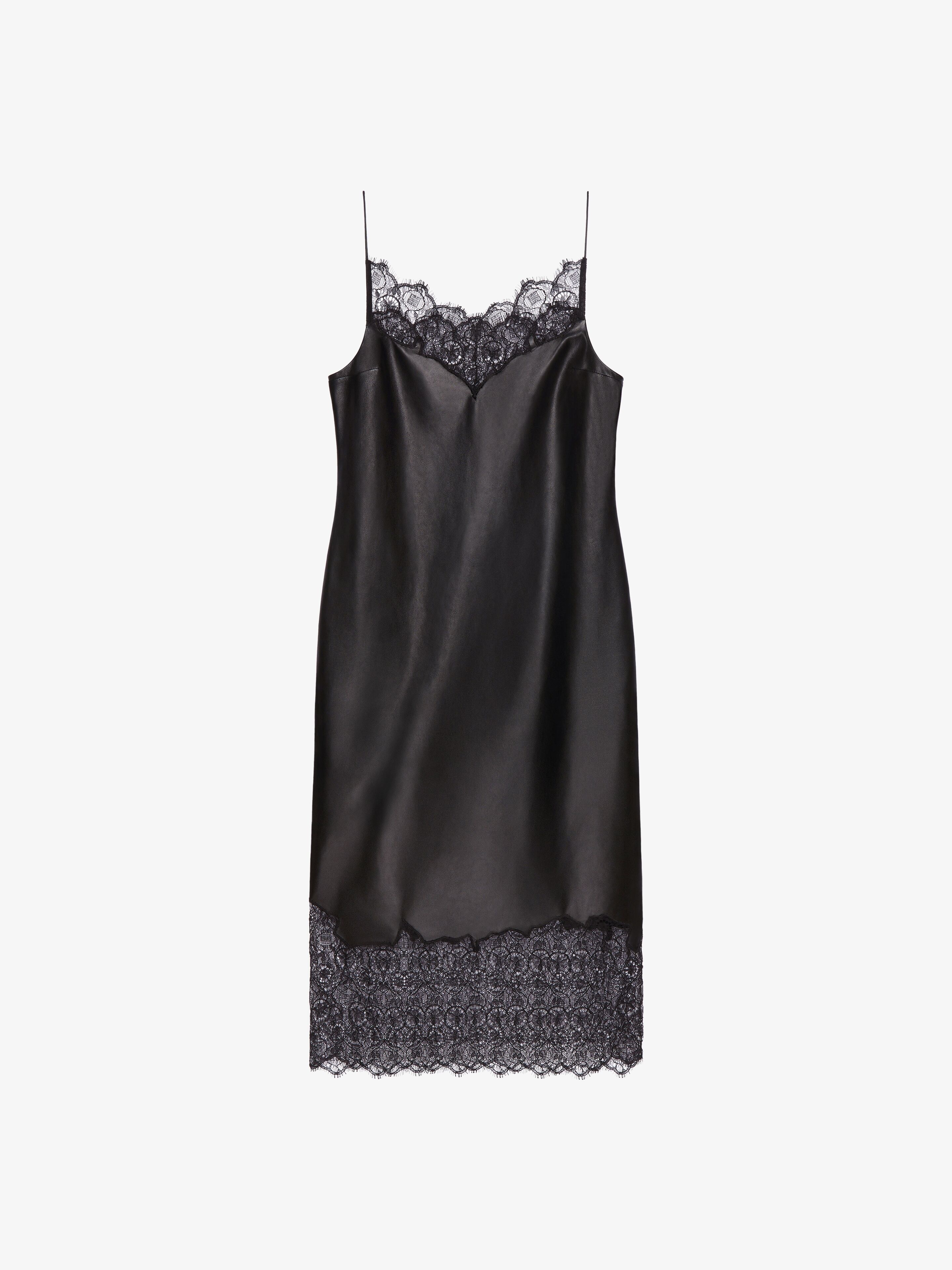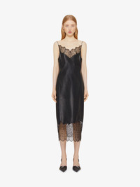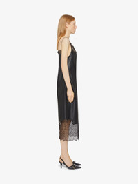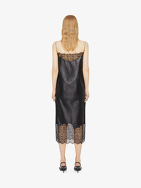 - Midi dress with thin straps in soft shiny nappa leather. - Lace with 4G details on the upper and the bottom. - Invisible zipped closure on the side. - Fluid straight cut. - Model measures 69.7 in and wears a size 36.