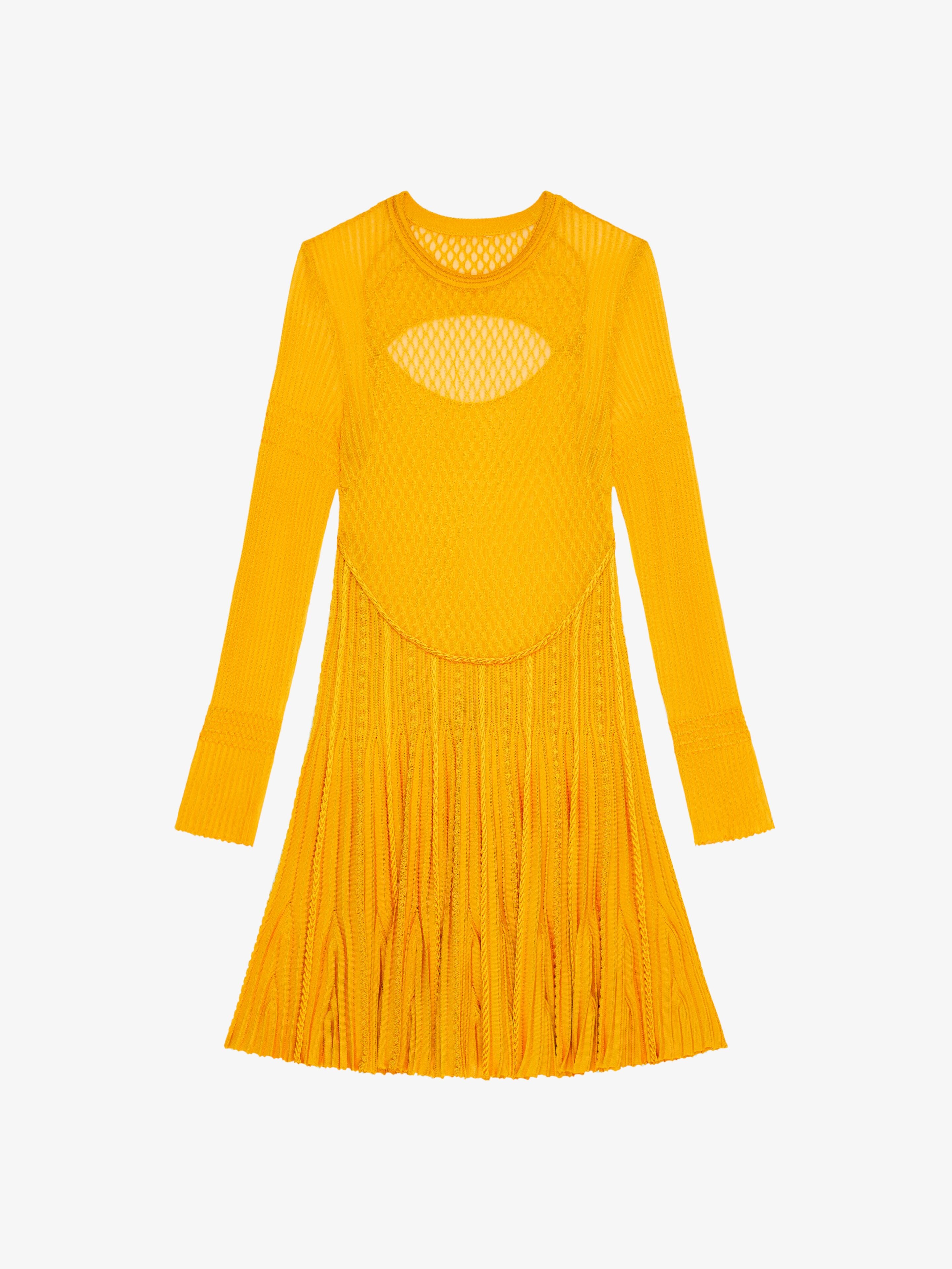 - Long-sleeved short dress in textured viscose knit. - Crew neck. - Graphic mix of decorative knit designs. - Pleated skirt. - Cut-out on the back.