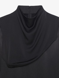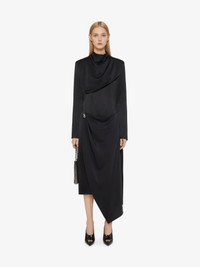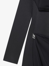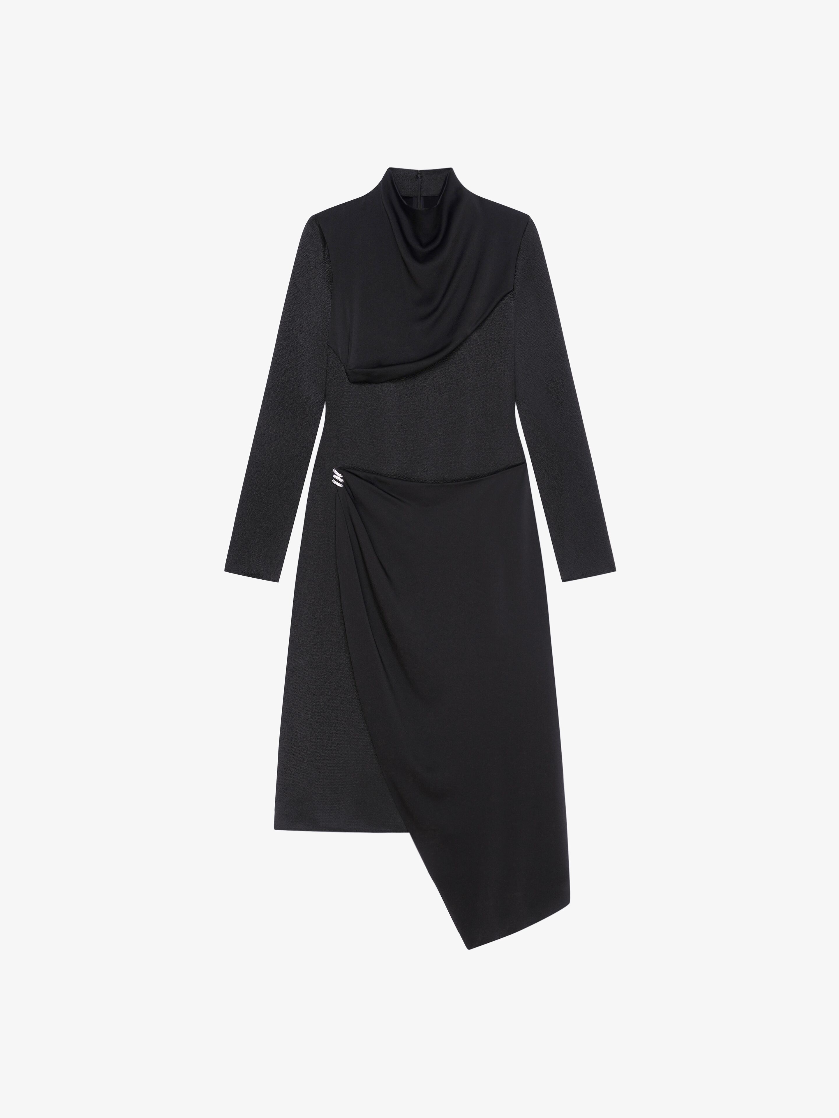 - Long dress with long sleeves in satin and crepe. - High neck. - Pleated effect on the front and on the side. - Three rings in crystals, stitch style on the side. - Invisible zipped closure. - Model measures 69.7 in and wears a size 36.