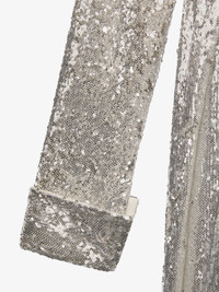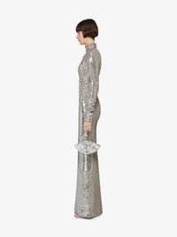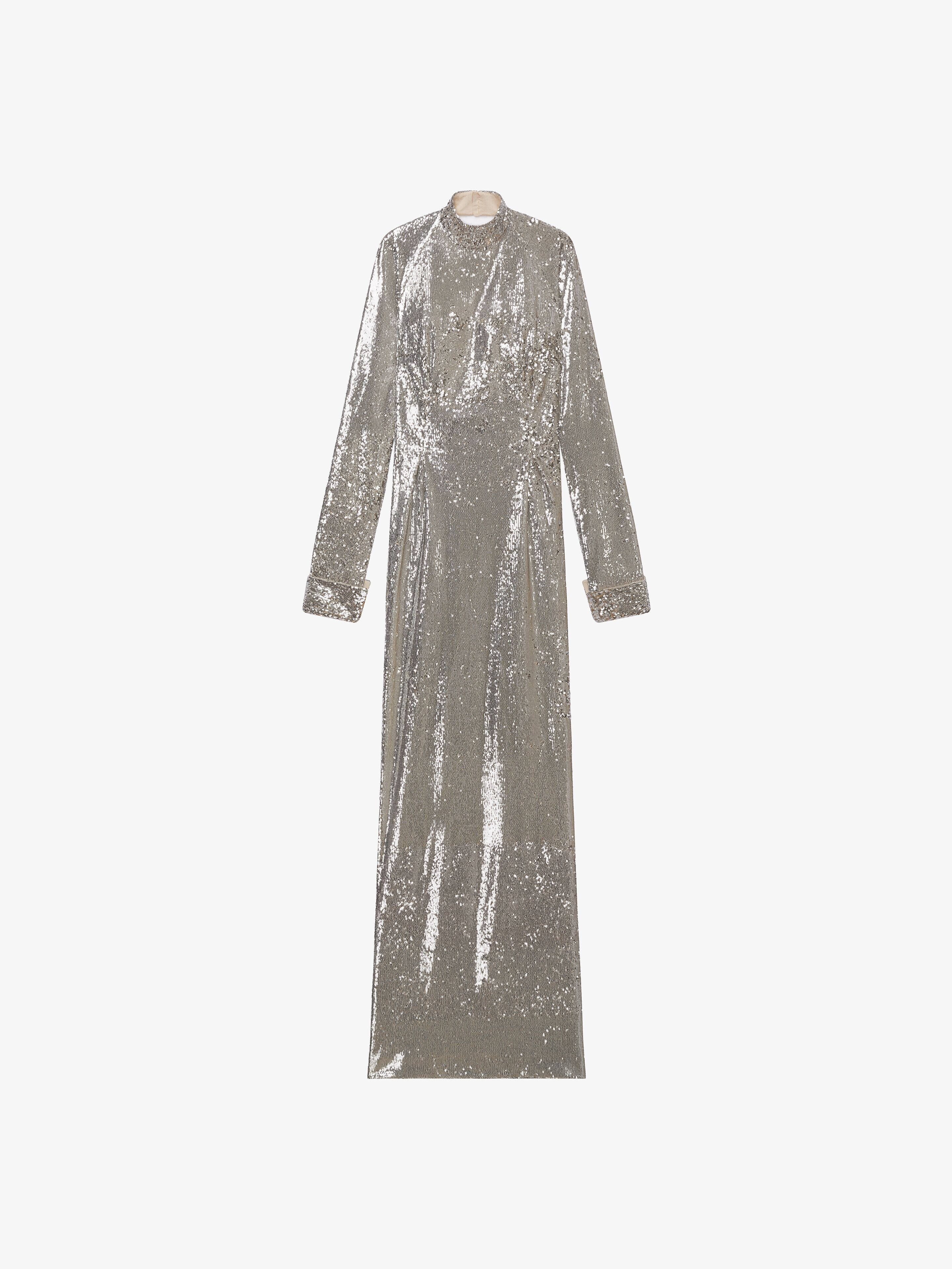 - Long-sleeved long dress with sequin embroidery all over. - Open-back effect. - High-neck collar. - Turn-back cuffs. - Invisible zipper closure on the back.