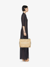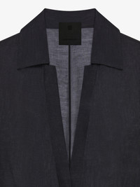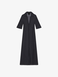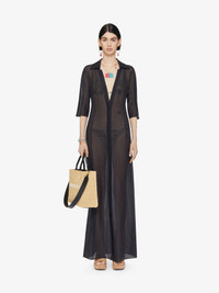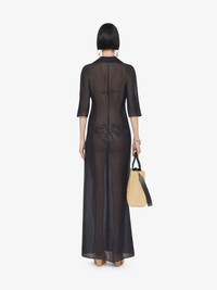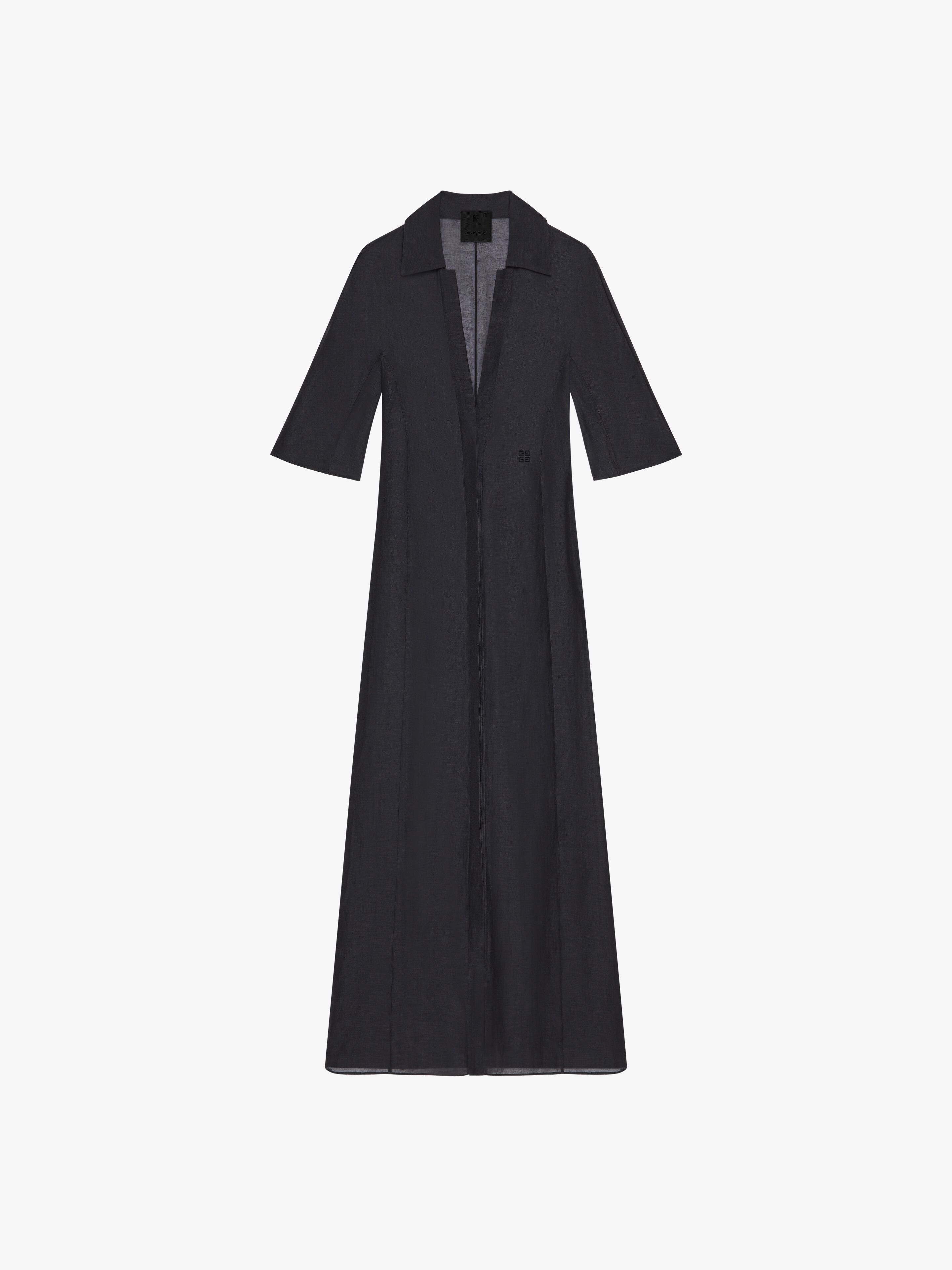 - Three-quarter sleeved long dress in semi-transparent silk and linen. - Shirt collar with plunging V neck. - Small tone-on-tone 4G emblem embroidered on the front. - Button closure on the front. - Model measures 69.7 in and wears a size 36.