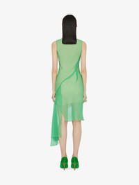 - Short sleeveless dress in silk chiffon. - Crew neck. - Ruffles on the side. - Lined. - Invisible zipped closure on the side.