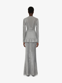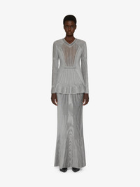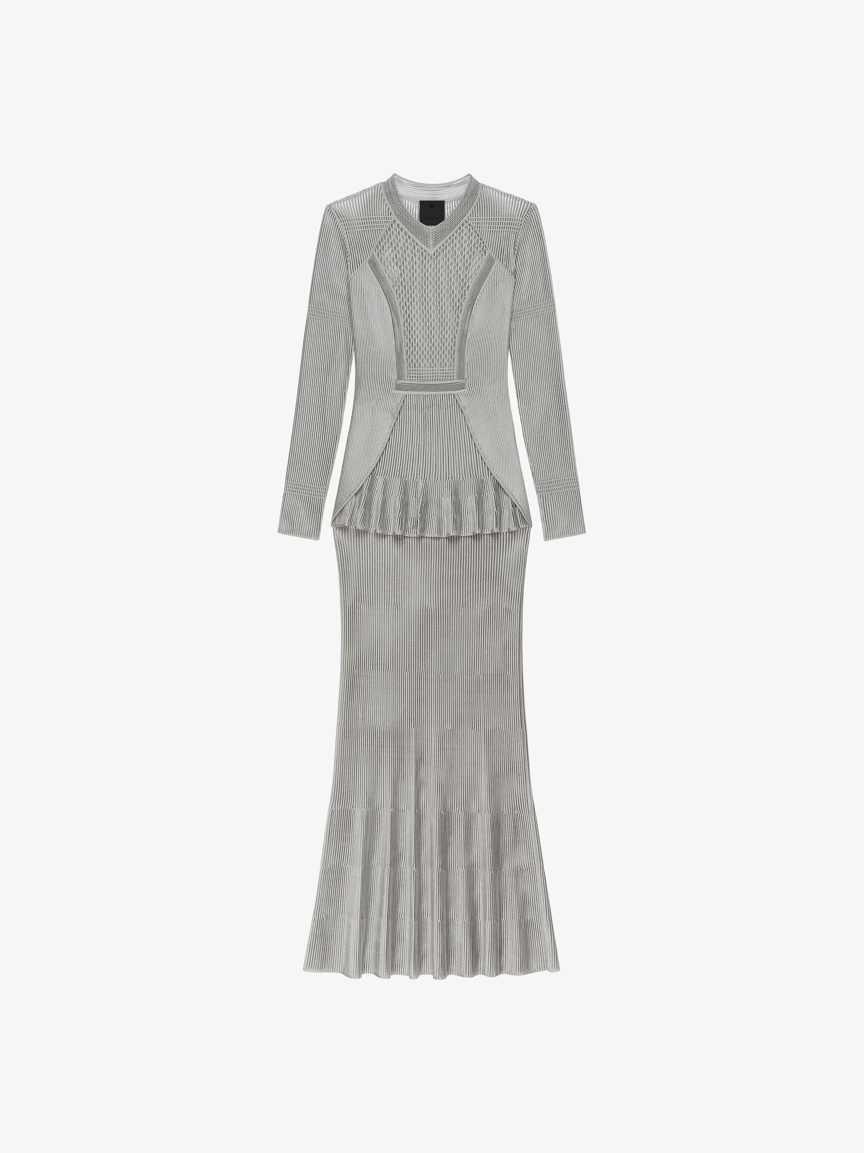- Long-sleeved long dress in ribbed viscose knit. - V-neck. - Graphic structured bust with mix of decorative transparent knit designs. - Overlaid ruffles on the hips and hem.