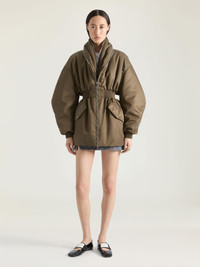 - Hourglass bomber in nylon. - Shawl collar with double zippers. - Zipped closure. - Two side flap pockets. - Elasticated knitted waist and cuffs. - Contrasting lining. - Couture seams for a cocooning volume and cinched waist. - Model measures 5.8 Feet and wears a size 36.