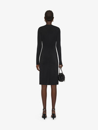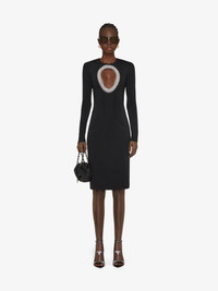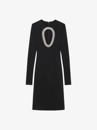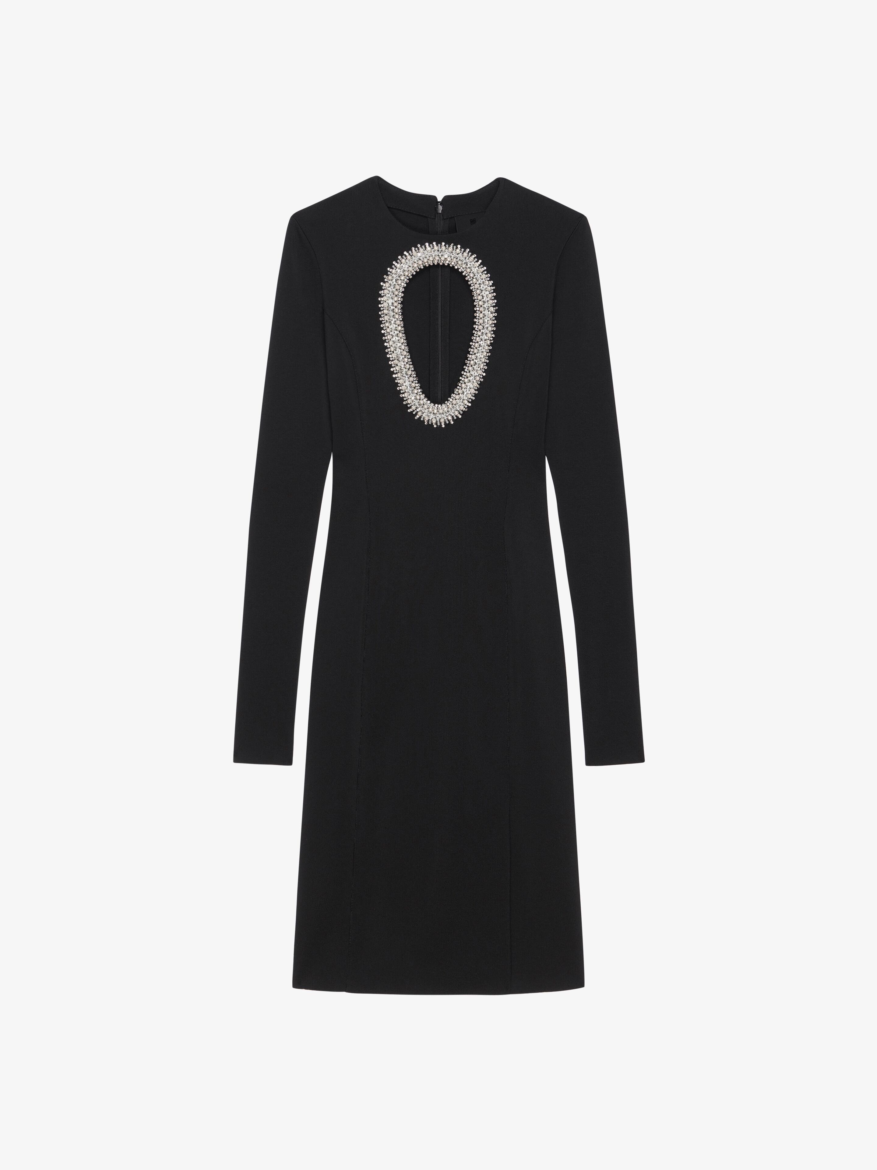 - Long-sleeves short evening dress in viscose knit with embroidered pearls and crystals on the front. - Opening on the front. - Crew neck. - Invisible zipped closure on the back. - Fitted cut.