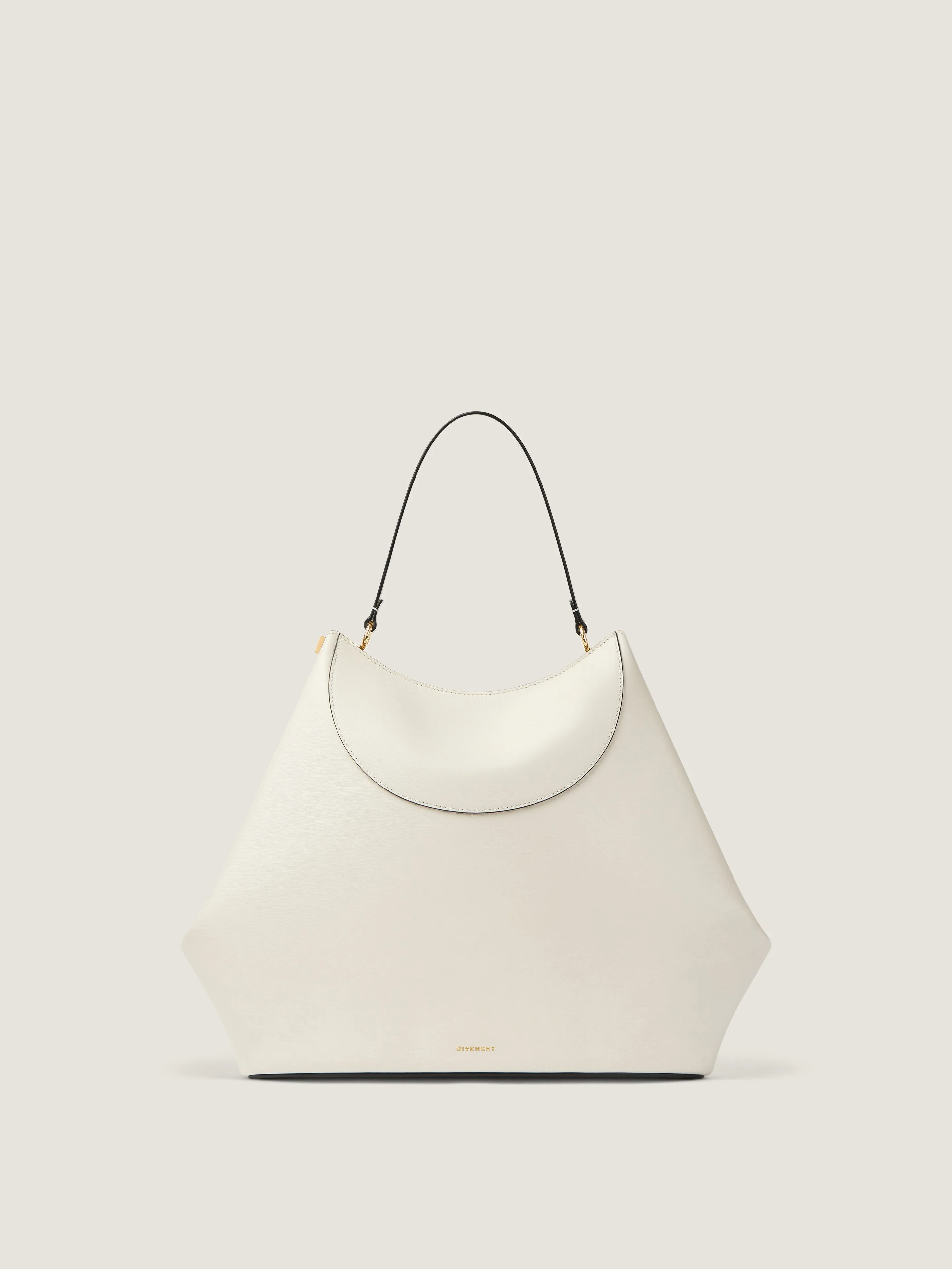 - Top handle bag in leather with natural grain and textured finishing. - Facet line. - Geometric shape and rounded edge construction molded in wood. - Functional metal hinge for easy opening and closing, engraved with GIVENCHY Paris signature. - Leather handle offering hand or shoulder carrying. - GIVENCHY signature embossed on the front and contrasting GIVENCHY Paris patch on the inside. - Contrasted hand made edges. - Leather side gussets. - One main compartment with one flat pocket inside. - Nappa lining.