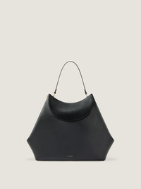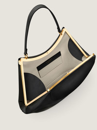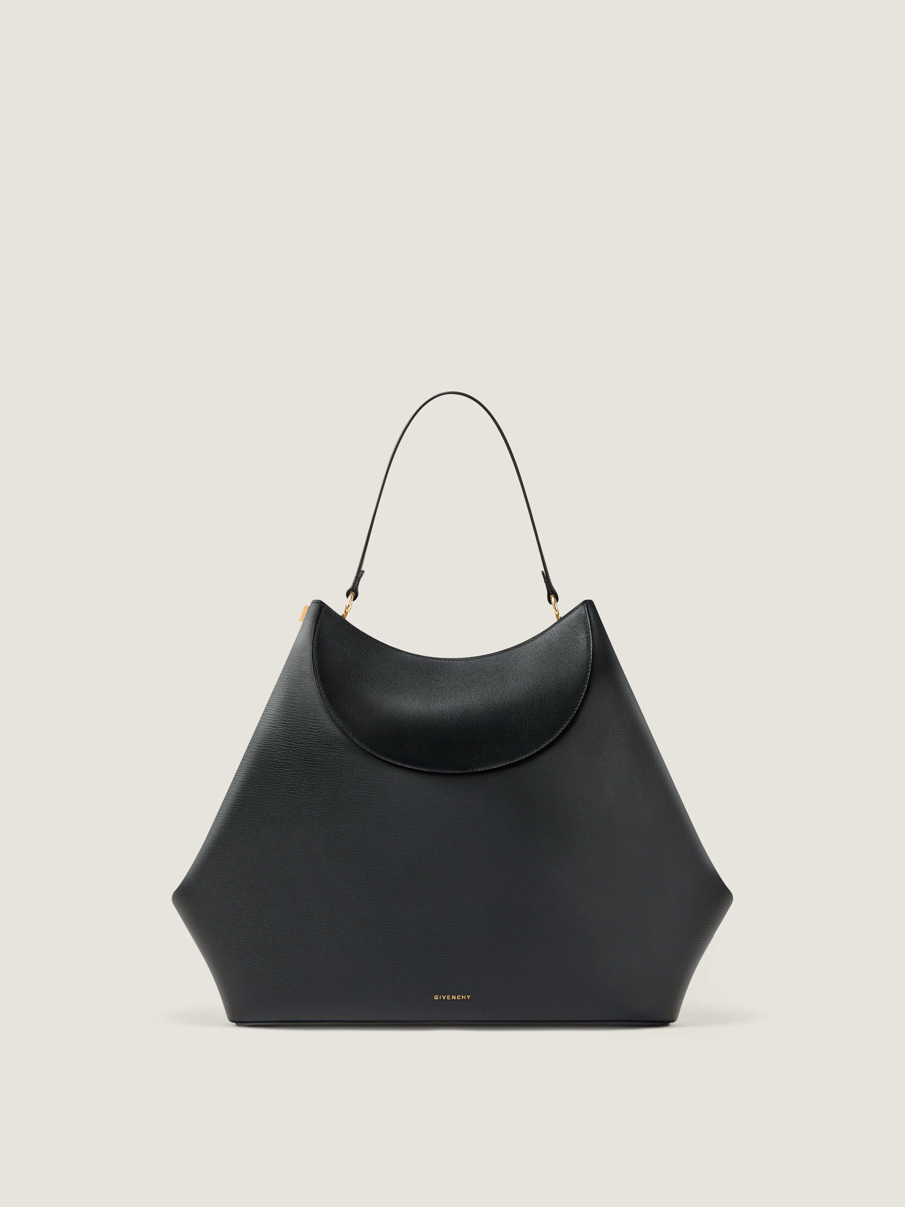 - Top handle bag in leather with natural grain and textured finishing. - Facet line. - Geometric shape and rounded edge construction molded in wood. - Functional metal hinge for easy opening and closing, engraved with GIVENCHY Paris signature. - Leather handle offering hand or shoulder carrying. - GIVENCHY signature embossed on the front and contrasting GIVENCHY Paris patch on the inside. - Hand made edges. - Leather side gussets. - One main compartment with one flat pocket inside. - Nappa lining.