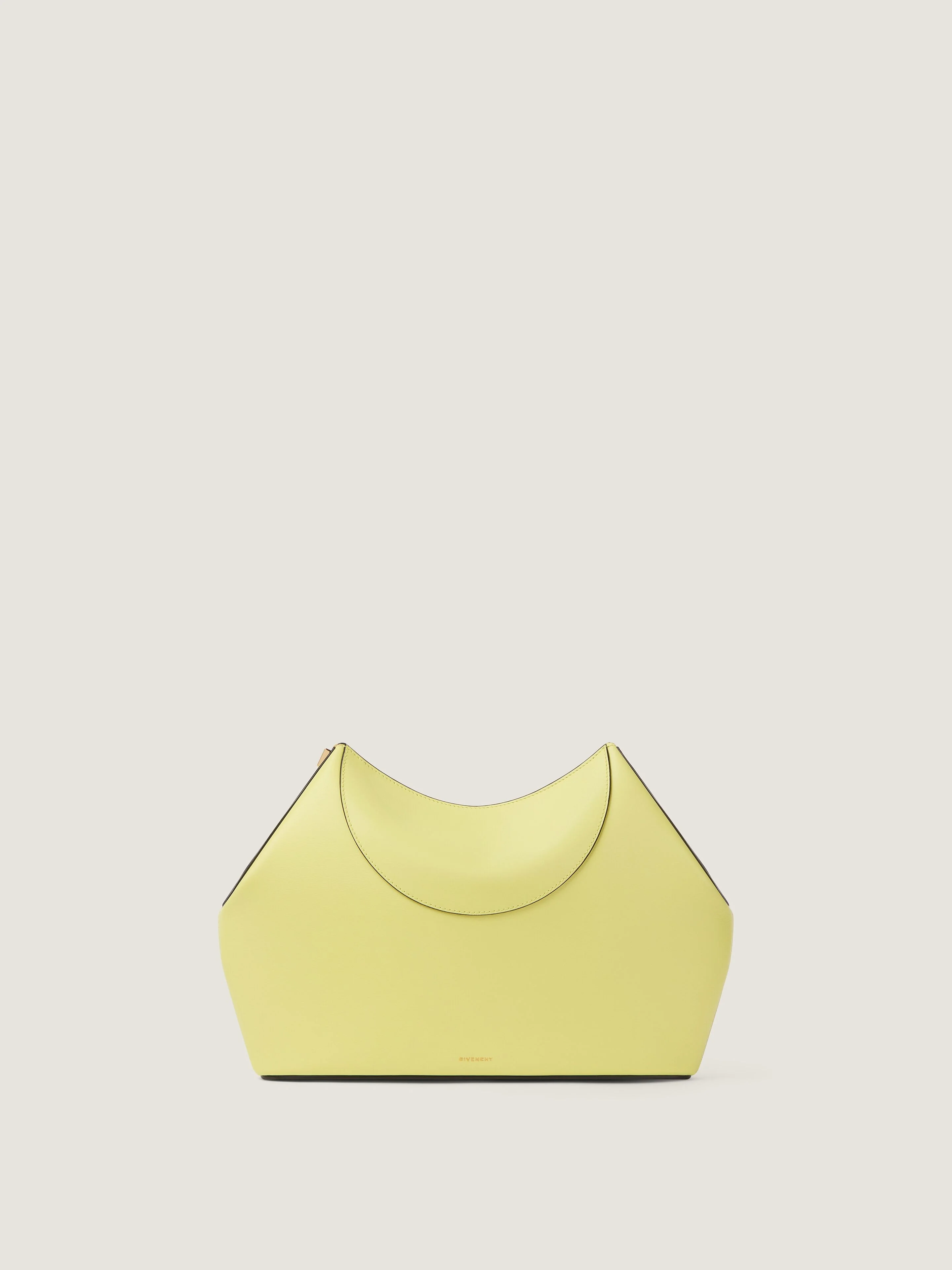- Clutch in leather with natural grain and textured finishing. - Facet line. - Geometric shape and rounded edge construction molded in wood. - Functional metal hinge for easy opening and closing, engraved with GIVENCHY Paris signature. - GIVENCHY signature embossed on the front and contrasting GIVENCHY Paris patch on the inside. - Contrasted hand made edges. - One main compartment with one card slot inside. - Nappa lining.