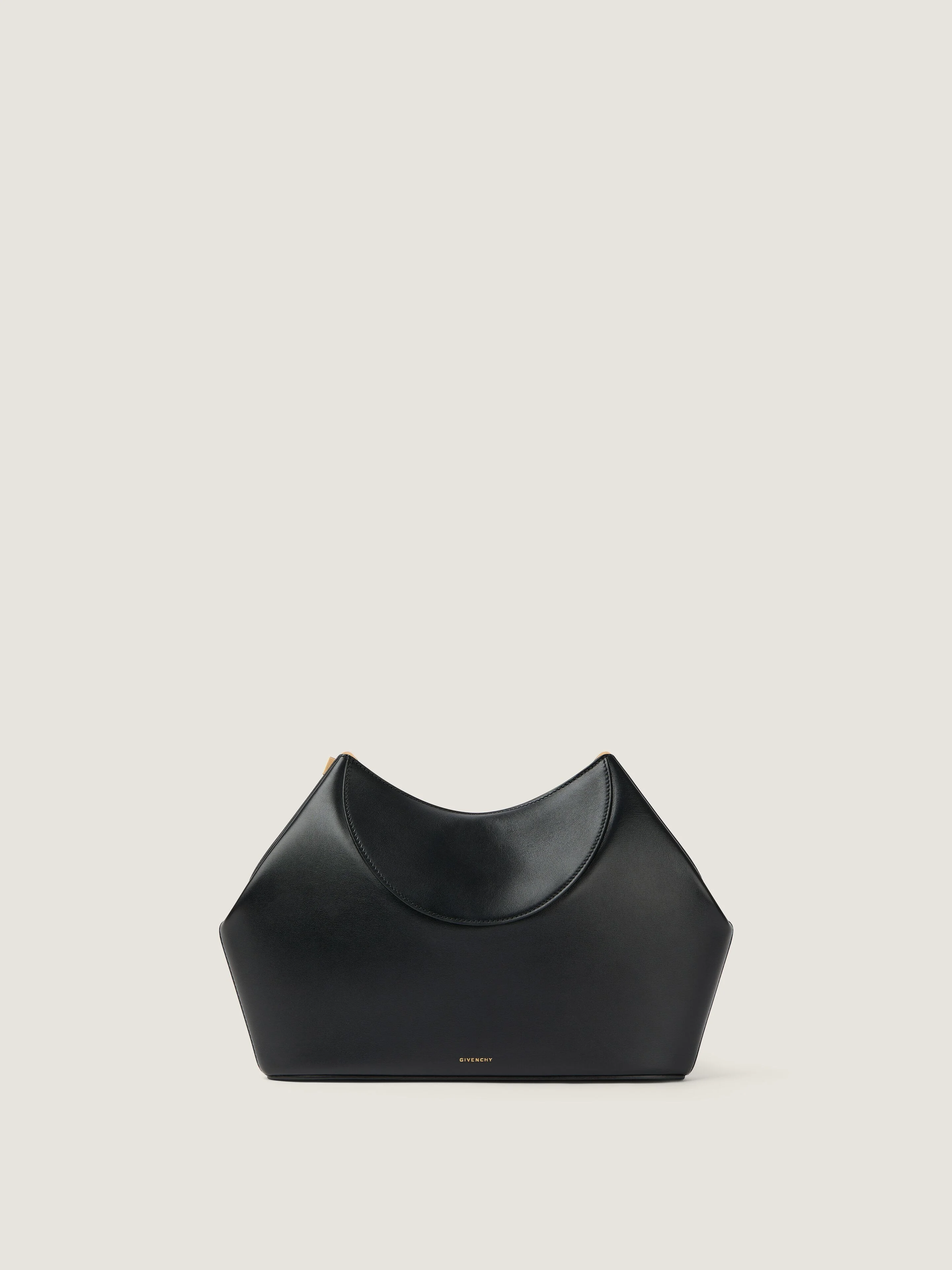 - Clutch in leather with natural grain and textured finishing. - Facet line. - Geometric shape and rounded edge construction molded in wood. - Functional metal hinge for easy opening and closing, engraved with GIVENCHY Paris signature. - GIVENCHY signature embossed on the front and contrasting GIVENCHY Paris patch on the inside. - Hand made edges. - One main compartment with one card slot inside. - Nappa lining.
