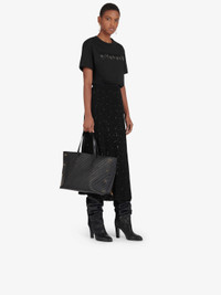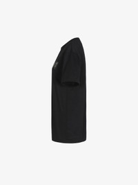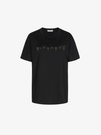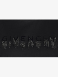 Black jersey T-shirt with black velvet GIVENCHY signature on the chest outlined with gradient-effect metallic bead embroidery. Product code: BW70753Z31-001 Composition: 100% cotton. Size & Fit Model wears a size 36. Model size: chest 80 cm, waist 60 cm, hips 80 cm, height 178 cm. Other Country of origin: Portugal. Hand wash, maximum temperature (40°C) Iron at maximum soleplate temperature (110°C) without steam Dry flat Do not bleach Do not dry clean
