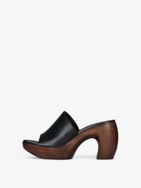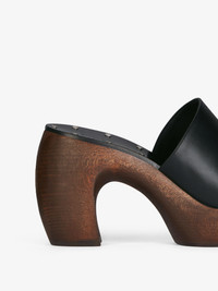 - Heel clog sandals in leather. - G Clog line. - Wood outsole. - Small GIVENCHY signature embossed on the front. - 4G emblem embossed on the heel. - Leather insole with studs and engraved GIVENCHY signature. - Heel height : 3.9 in. - Platform height : 1.6 in.