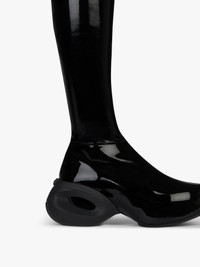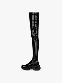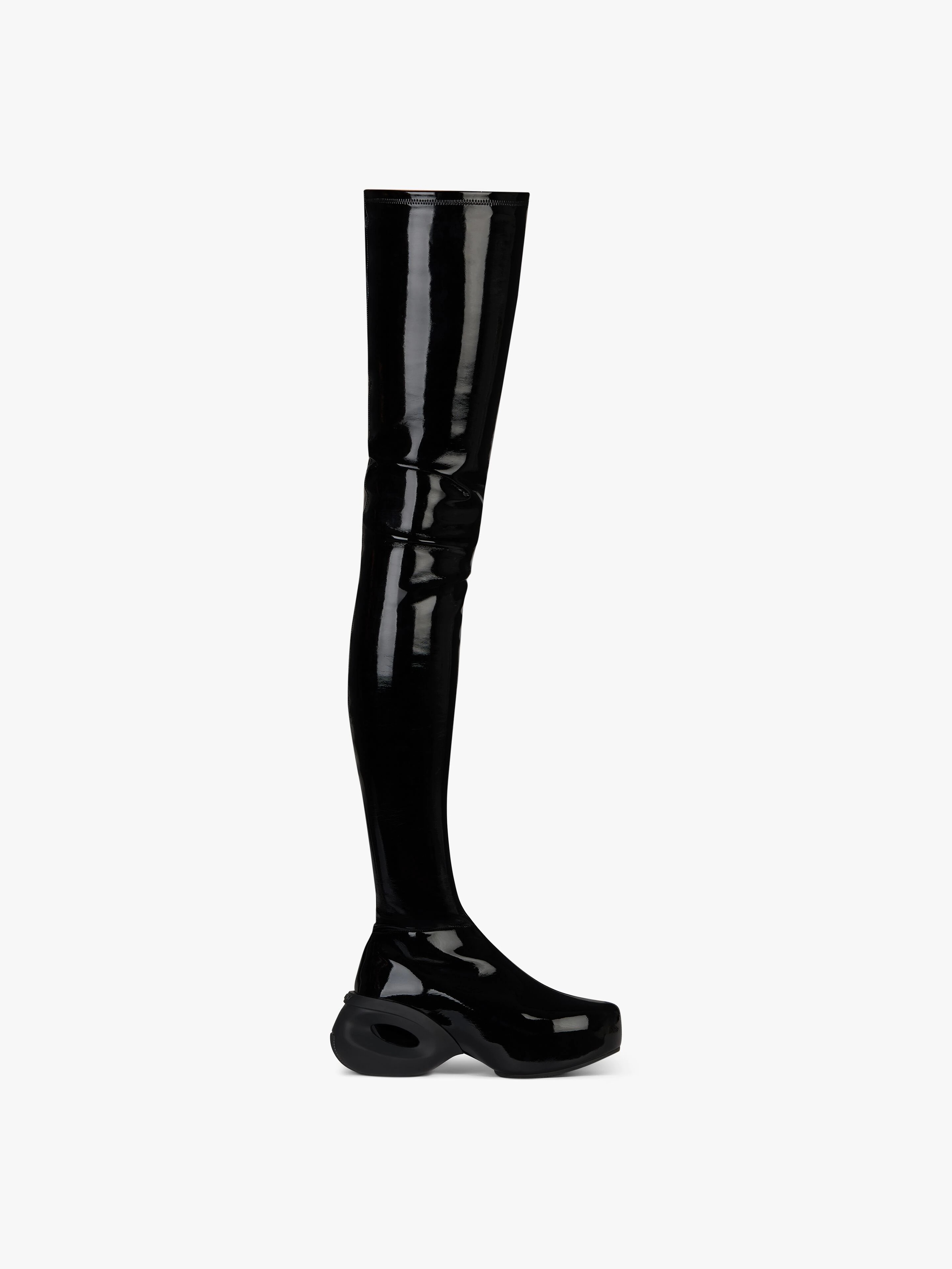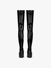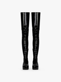 - Thigh boots in stretch patent leather. - Color: black. - Rounded shape entirely covered with leather. - Graphic rubber heel with raised GIVENCHY signature. - Zipper closure on the inside of the foot. - Leather insole with GIVENCHY 4G signature. - Heel and platform height: 2 in.