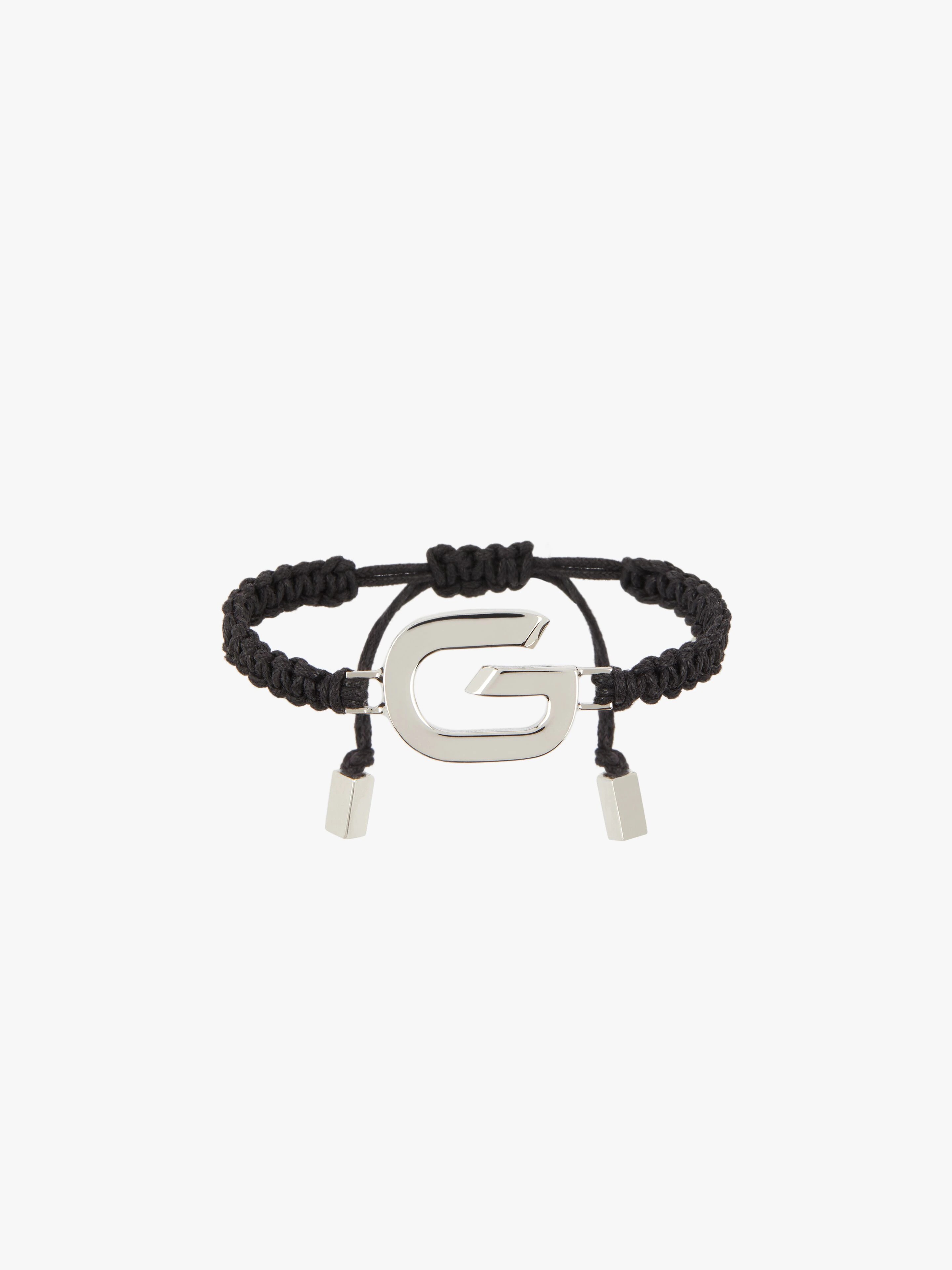 - Bracelet in waxed cotton rope and polished metal. - Finishes: black and silver. - G piece and metal ends. - Adjustable bracelet.