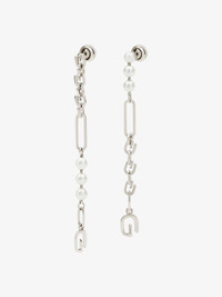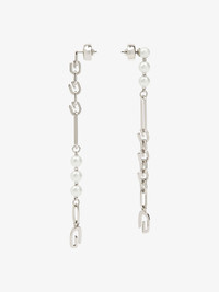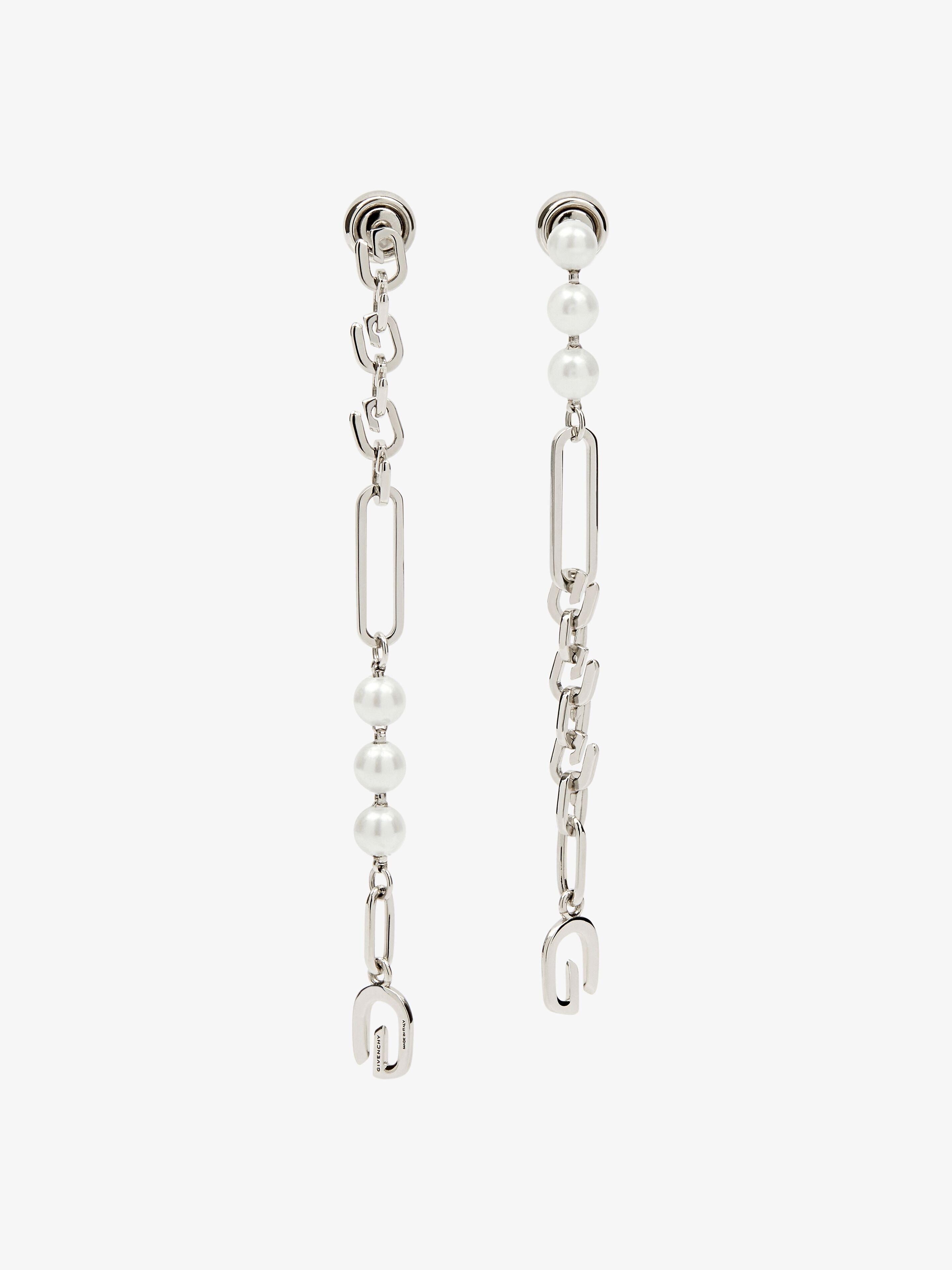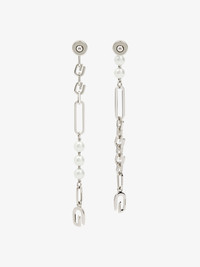 - Asymmetrical pendant earrings in silvery-finish polished metal. - G Link line. - Three pearls and set of G and decorative links, reversed on the right and left ear. - G tip. - Sold by pair.