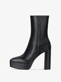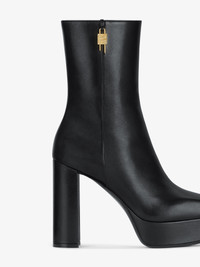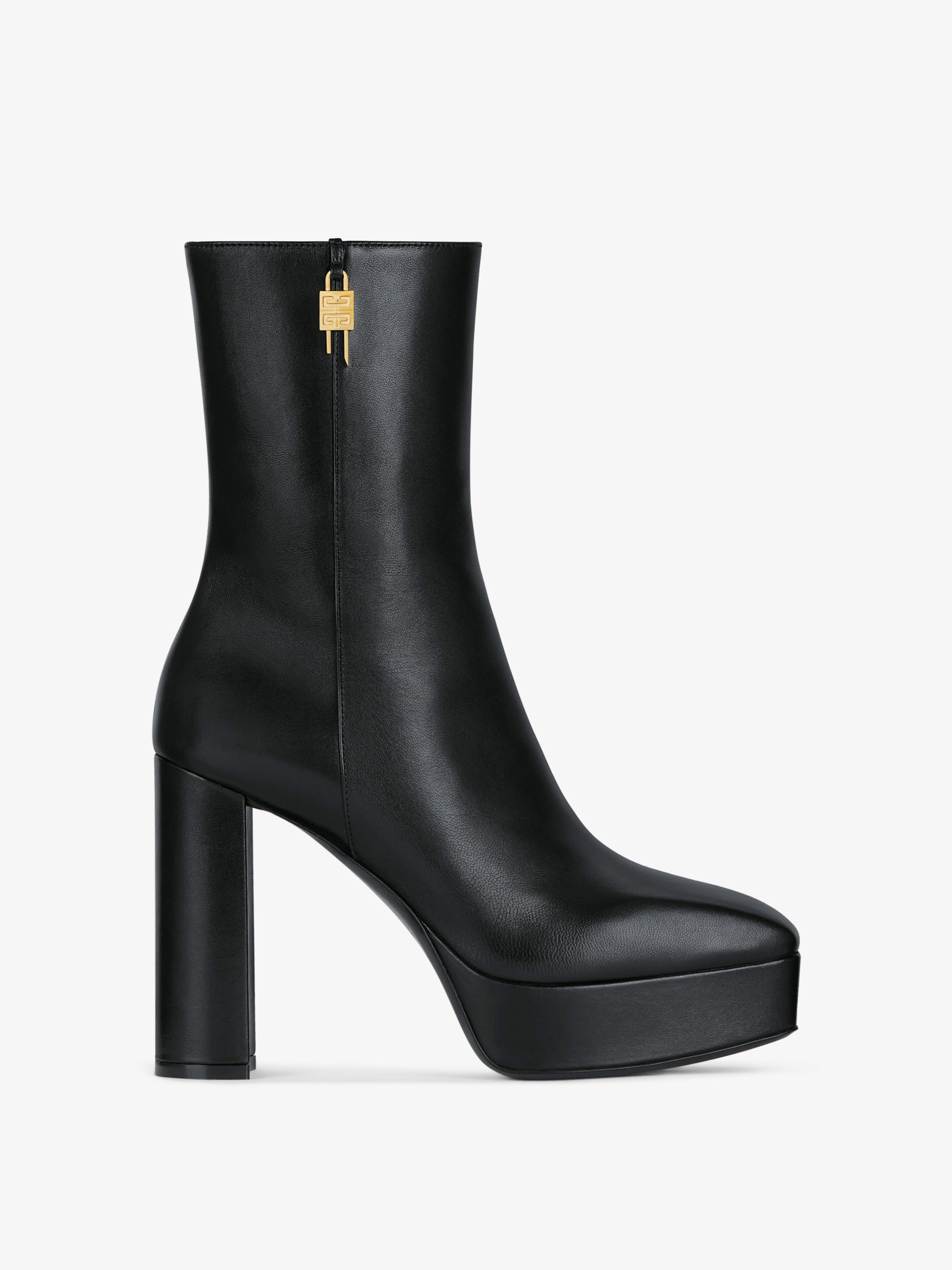 - Platform ankle boots with squared toe in goat leather. - G Lock line. - Small golden-finish 4G padlock on the right side. - Hidden zipper on the inside of the foot. - Thick heel. - Heel height : 4.5 in. - Platform height : 1.8 in. - Comfortable.