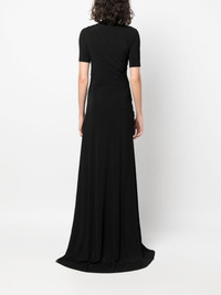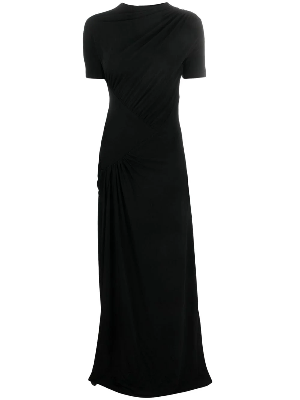 gathered short-sleeve maxi dress Highlights - Black - Stretch-design - Gathered detailing - Mock neck - Short sleeves - Slim cut - Floor-length - Concealed side zip fastening Made in Italy Composition Viscose 85%, Polyamide 12%, Spandex/Elastane 3% SIZE & FIT Model measurements Height 5 ft 9 in(1.76 m) Bust/Chest 33.07 in(84 cm) Hips 34.64 in(88 cm) Waist 25.59 in(65 cm) FittingInformation Designed for a close fit throughout Particularly long in length; consider your own measurements Made from a midweight stretch fabric, this piece offers elasticity and flexibility when worn This piece fits true to size – take your usual size