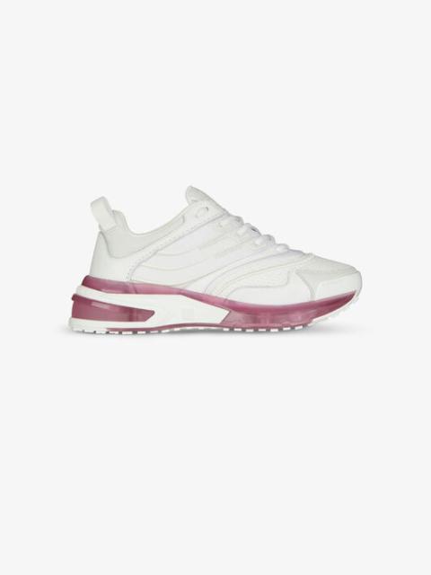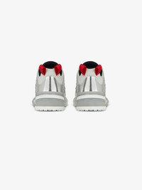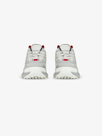 DETAILS - Sneakers in grained calfskin leather, mesh and technical canvas. - Color: silver. - Aerodynamic design. - Nubuck and white TPU injected details. - Graphic embroidery. - Small contrasting red canvas bands. - Debossed 4G emblem on the tongue. - 360° transparent silver sole with white reinforcements. - 4G emblem and raised GIVENCHY signature on the sole. - All-over 4G emblems on the sole. - Composition : 100% calfskin leather. Lining: 100% polyamide. - Country of origin: Italy. - Product code: - BE001ME120-040