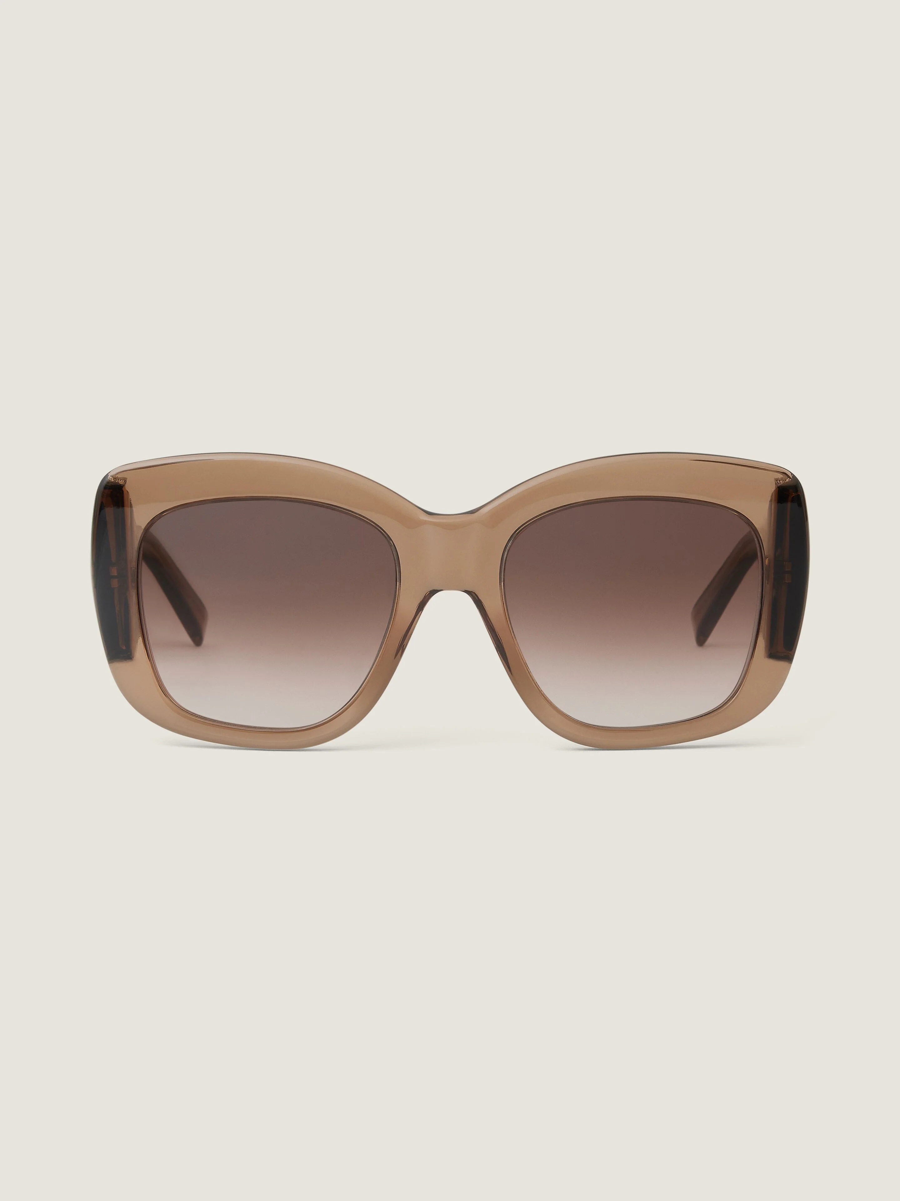 - Sunglasses in acetate. - GIVENCHY Bold line. - Large square shape. - Gradient brown lenses. - Golden GIVENCHY signature engraved on the temples. - Golden-finish metal detail on the hinges. - 100% UVA/UVB protection. - Weight: 73g. - Model comes in a soft case.