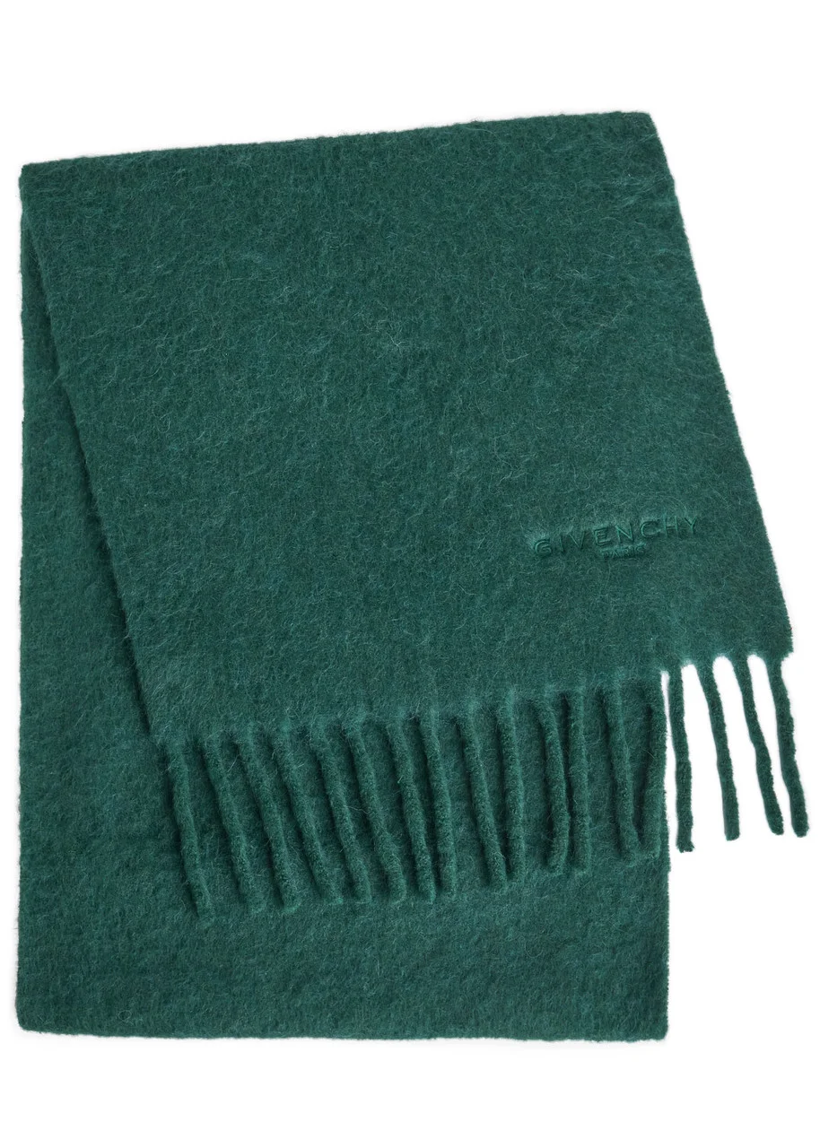 Info & Care Givenchy alpaca-blend scarf Embroidered logo, fringed ends, brushed finish 60% alpaca, 23% virgin wool, 15% polyamide Dry clean Size & Fit Width: 16.5 inches/ 42cm Length: 100 inches/ 255cm