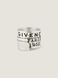 - Ring in silvery-finish textured metal. - GIVENCHY Tape line. - GIVENCHY Paris 1952 in black enamel on the front. - GIVENCHY signature engraved on the inside. - Matching cuff bracelet and earrings sold separately. - Weight per unit: 11g.