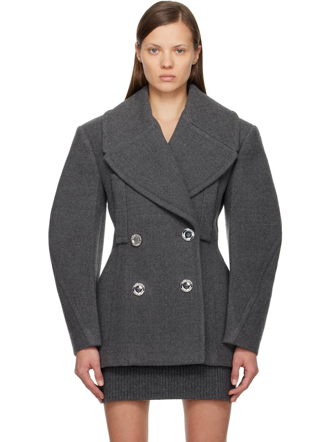 Wool- and silk-blend melton peacoat. · Notched lapel · Double-breasted button closure · Seam pockets at chest · Padded shoulders · Full satin lining · Logo-engraved silver-tone hardware Supplier color: Slate blend Body: 99% wool, 1% silk. Lining: 100% viscose. Made in Italy 252278F063003
