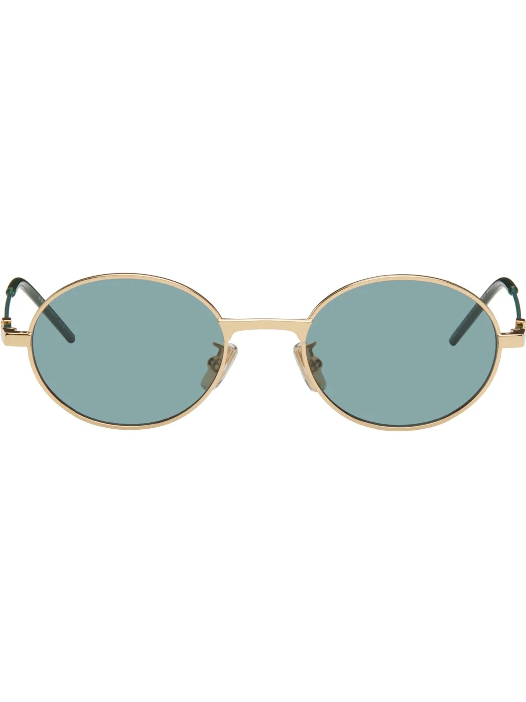 Round metal-frame sunglasses in gold tone. - Green lenses - 100% UVA/UVB protection, Category 3 - Adjustable rubber nose pads - Logo hardware at temples - Logo etched at nylon temple tips - Includes pouch - Size: 51.20 145 Supplier color: Green/Golden