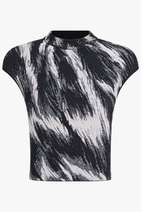 The Givenchy High-Neck Short-Sleeve Marble Crop Top in Grey Mix fuses bold patterning with sculptural minimalism. Crafted in a tactile stretch knit, it features a dynamic marble-inspired jacquard motif in tonal shades of black, grey, and ivory. The high neckline and structured cap sleeves create a modern, architectural silhouette, while the cropped length balances its graphic impact with a sleek, body-contouring finish. A statement piece that embodies Givenchy’s precision and edge, it transitions seamlessly from day to night styling. - Fabrication: 70% viscose, 30% polyester - Stretch knit with tonal marble jacquard pattern - High neckline and structured cap sleeves - Cropped silhouette with clean, fitted finish - Slip-on style Style it with tailored high-waisted trousers or a sleek midi skirt for a sharp, contemporary look that showcases Givenchy’s signature graphic sophistication. Measurements Size XS: Bust 80cm, Waist 76cm, Hip 70cm, Length 48cm Size S: Bust 84cm, Waist 80cm, Hip 72cm, Length 48cm