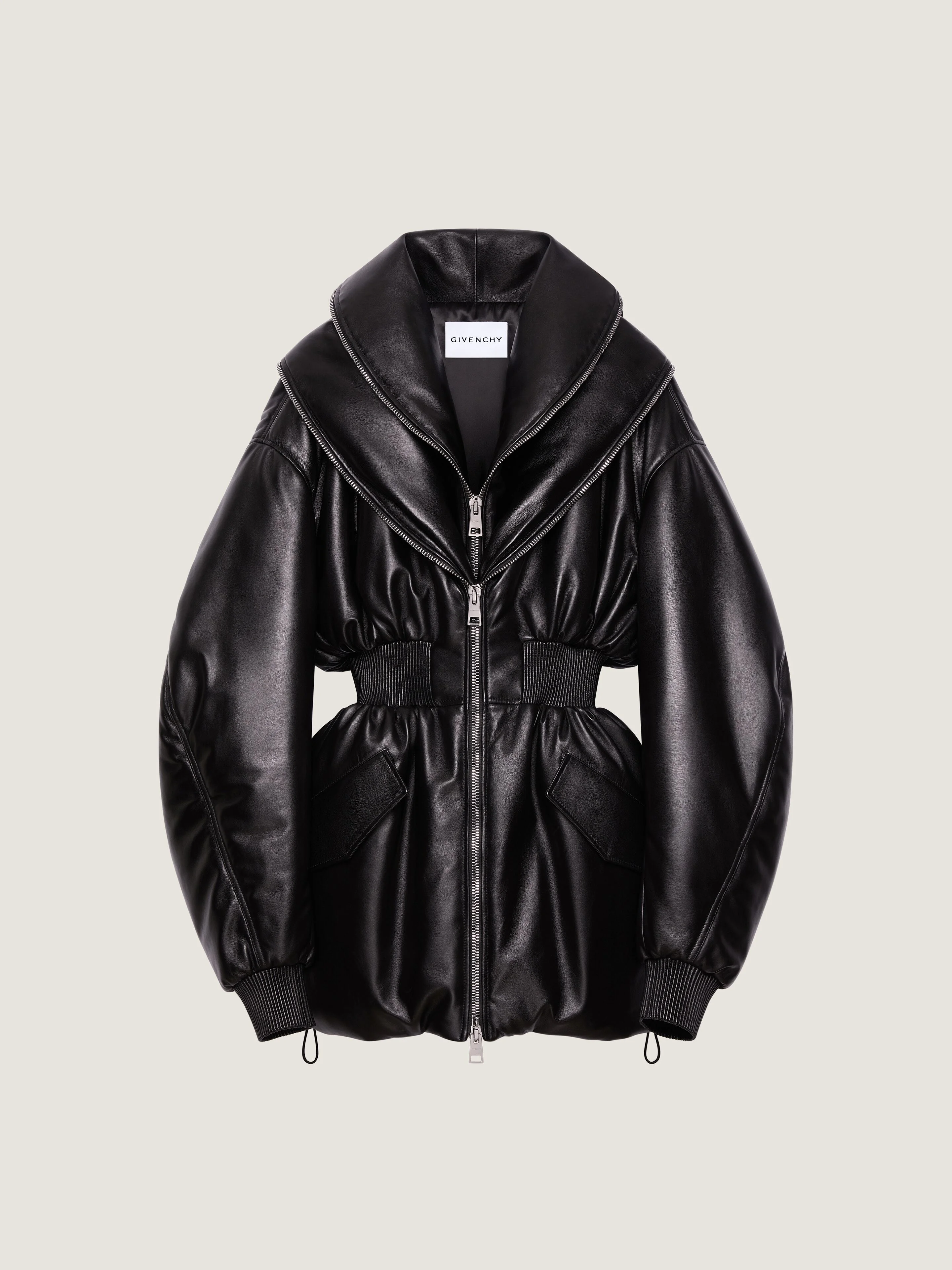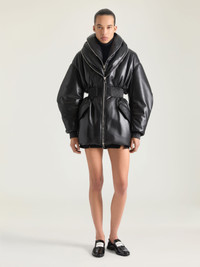 - Hourglass bomber in nappa leather. - Shawl collar with double zippers. - Zipped closure. - Two side flap pockets. - Elasticated waist and cuffs. - Satin lining. - Couture seams for a cocooning volume and cinched waist. - Model measures 5.8 Feet and wears a size 36.