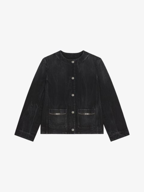 - Short jacket in denim. - Crew neck. - Button closure. - Two front pockets with metal G chains and 4G pieces.