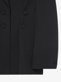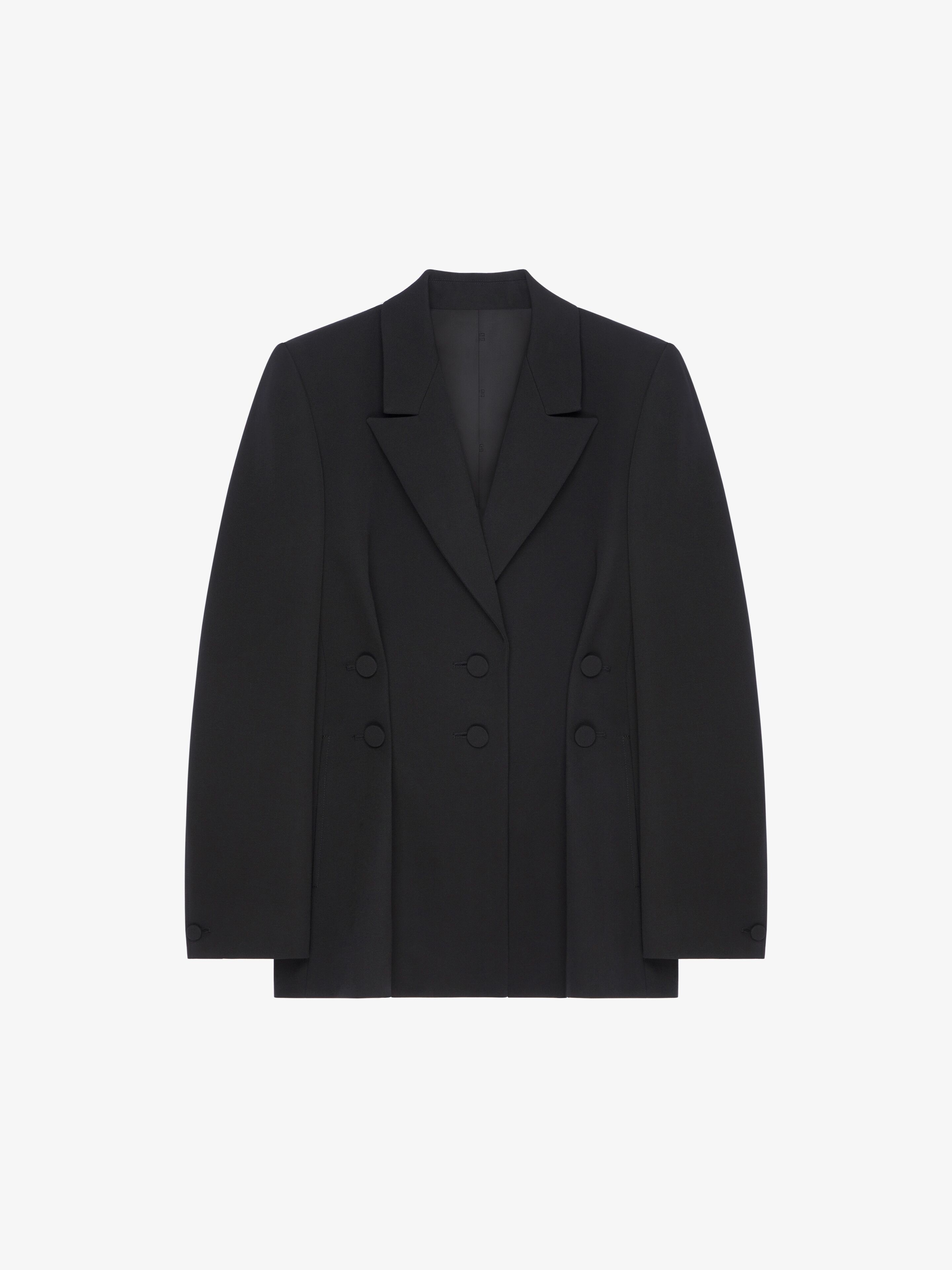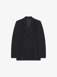 - Structured jacket in tricotine wool. - Pointed collar. - Buttons on the front with pleated effect. - Two side pockets.