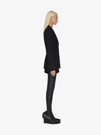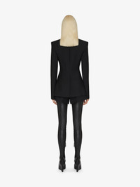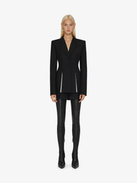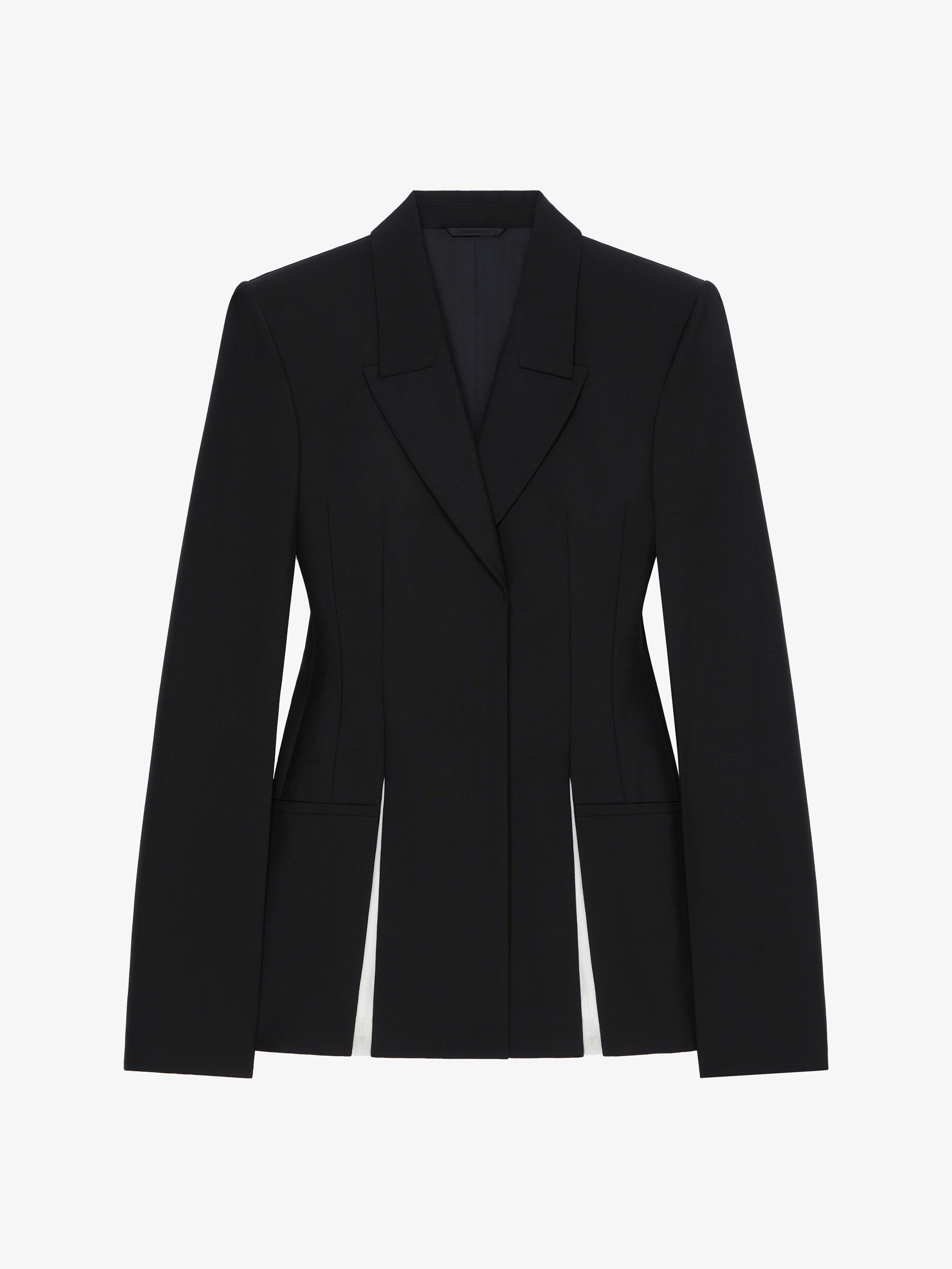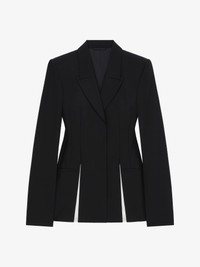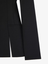 - Tailored jacket in wool and mohair. - Peak lapel with overlaid effect. - Slits on the hem trimmed with contrasting, smocked and raw-edged silk georgette. - Invisible buttoned closure. - Two welt pockets on the sides. - Tone-on-tone lining with 4G motif.