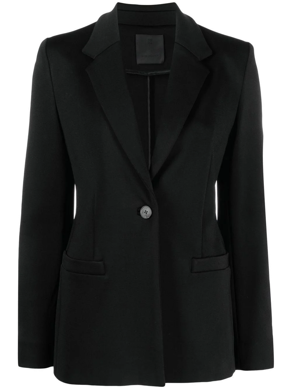 single button blazer For SS23, Givenchy adds a sleek twist to the conventional blazer. Presented in timeless black, this garment is cut to a single button fastening and notched lapels for a minimal take on tailoring. Made in Italy Composition Viscose 81%, Polyamide 17%, Spandex/Elastane 2% SIZE & FIT Model measurements Height 5 ft 10 in(1.77 m) Bust/Chest 32.28 in(82 cm) Hips 35.03 in(89 cm) Waist 25.19 in(64 cm) Measurement SLEEVE LENGTH 24.8 in(63 cm) LENGTH 27.95 in(71 cm)