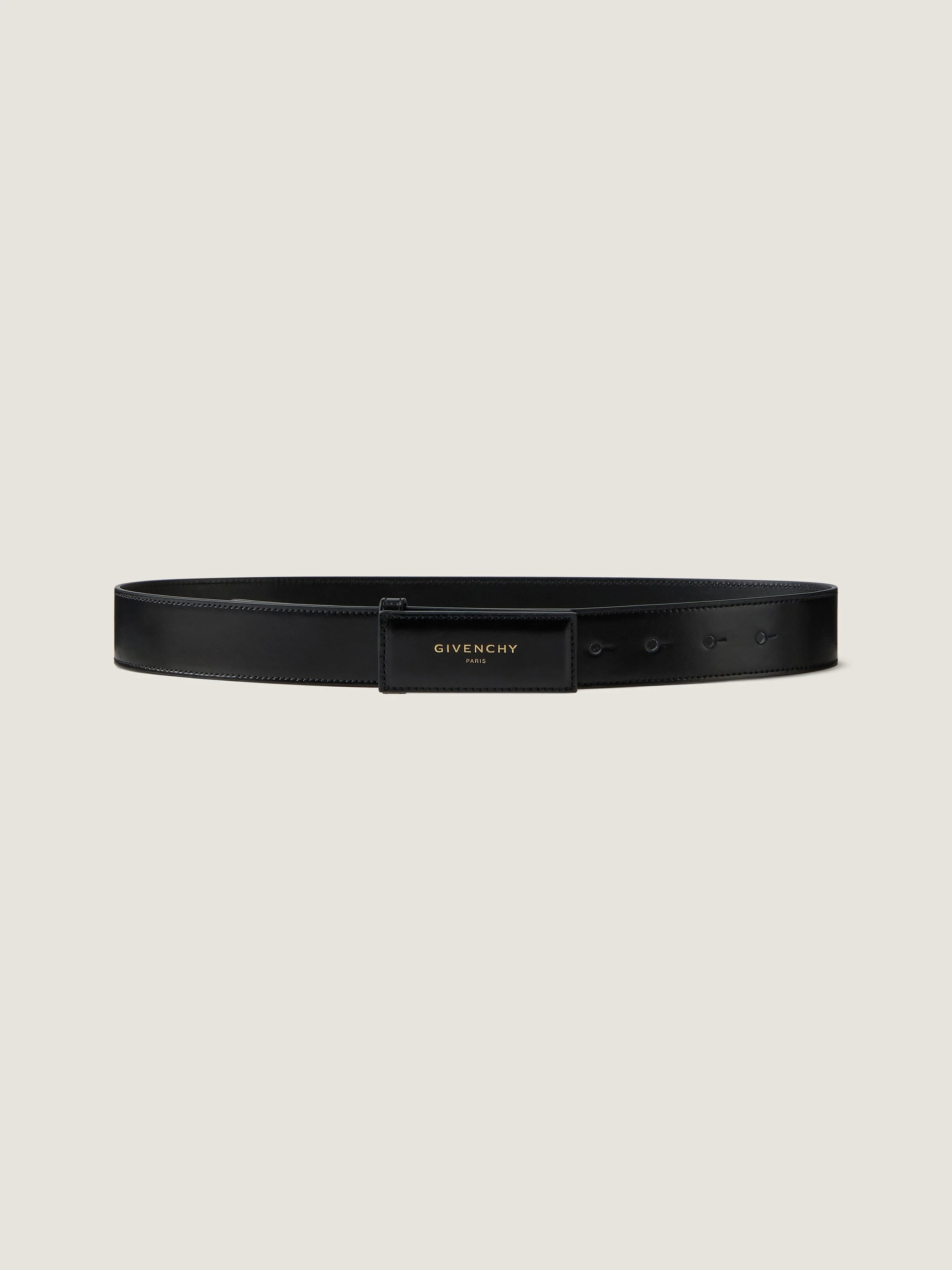- Belt in Box leather. - Label line. - Leather buckle with GIVENCHY Paris signature. - Adjustable to be worn in a classic way or at the waist. - Width: 1.4 in.