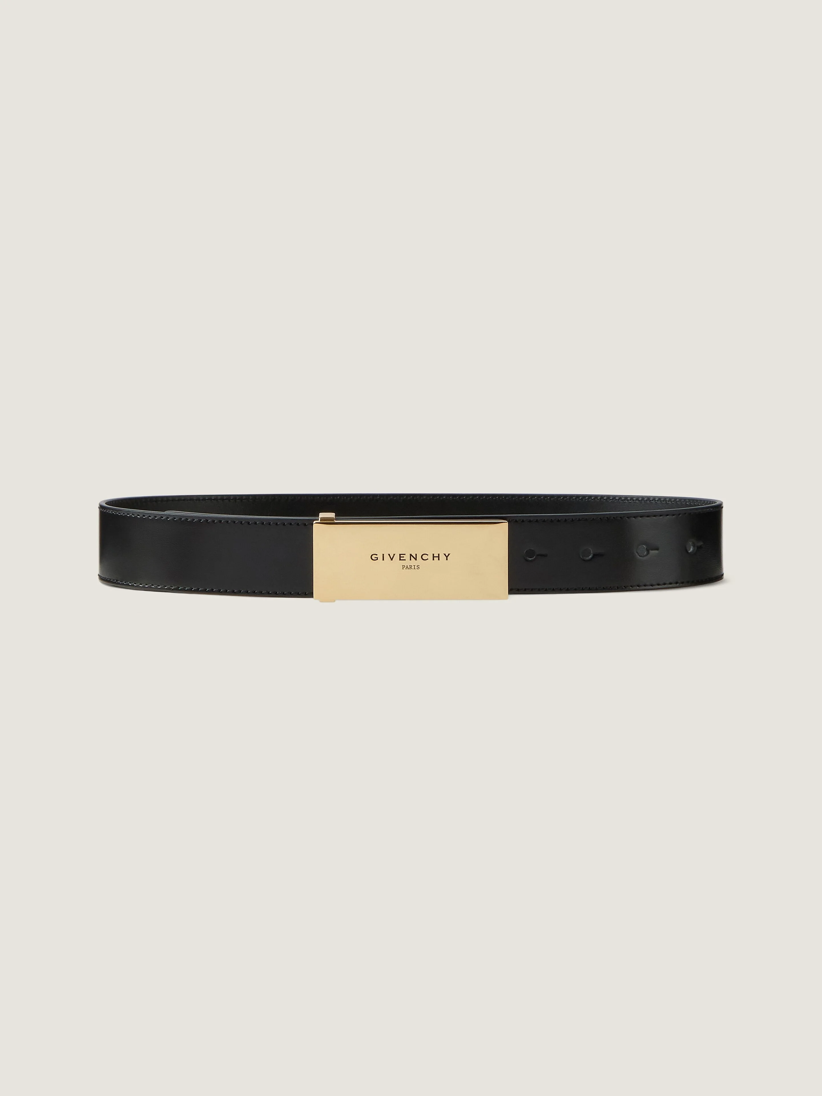 - Belt in Box leather. - Label line. - Golden-finish metal buckle with GIVENCHY Paris signature. - Adjustable to be worn in a classic way or at the waist. - Width: 1.4 in.