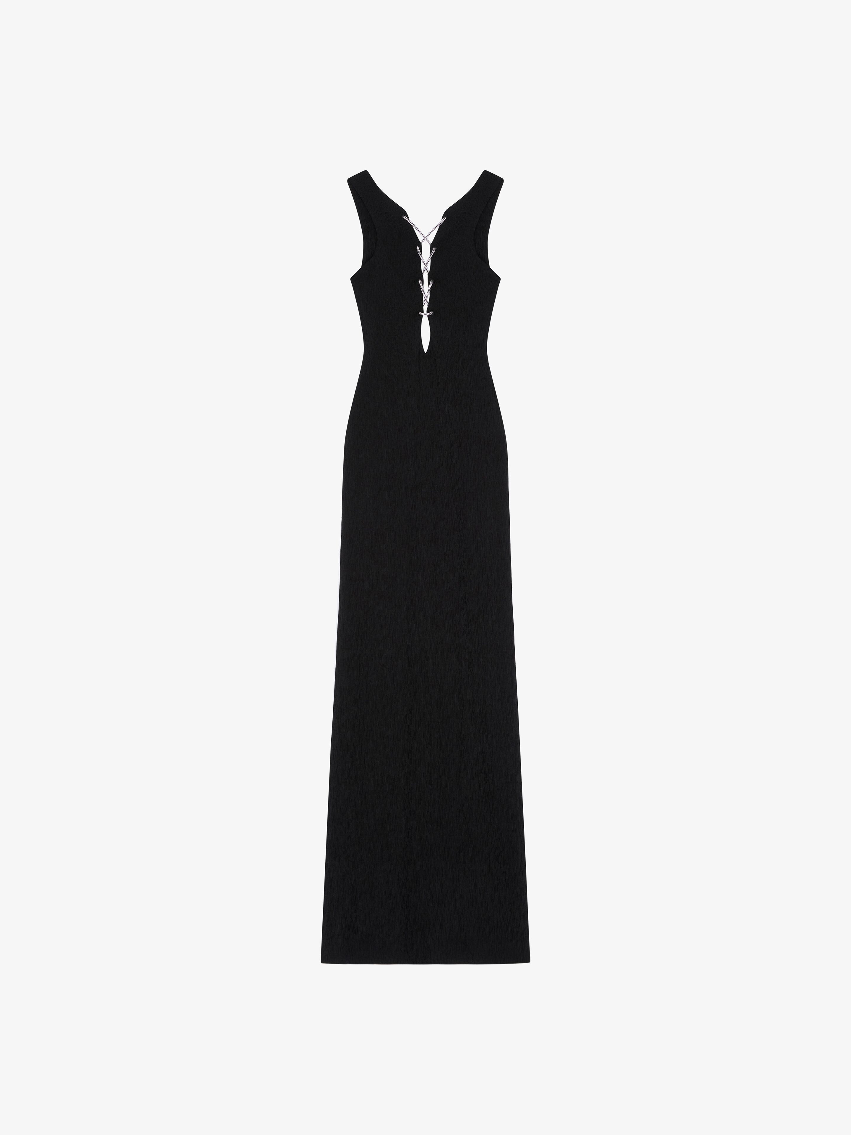 EVENING DRESS IN TEXTURED JERSEY WITH CRYSTAL LACES