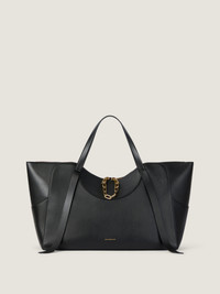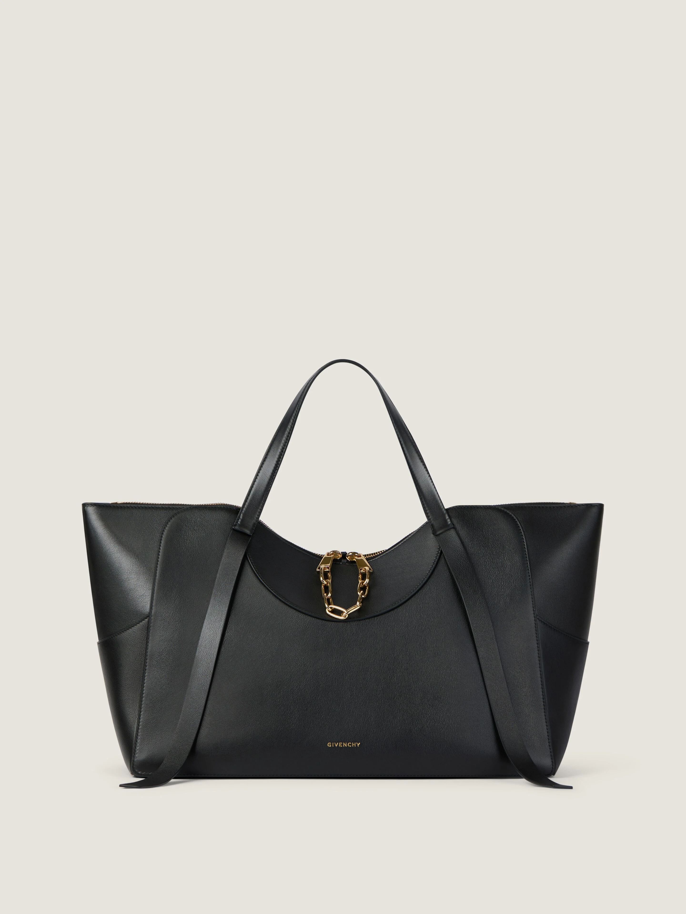 - The Snatch is a study in intimacy. A sensual object that slips naturally into the language of Sarah Burton’s ready-to-wear: sculptural, feminine, shaped around the body. Its lines echo the cinch of a jacket, the shape of a waist, the curve of a bra. The leather’s softness holds a quiet tension: the bag pulls, cinches, embraces. - Large bag in soft grained calfskin leather. - The Snatch line. - Geometric shape. - Zipped closure with GIVENCHY engraved zipper and functionnal metal chain. - Leather handles for hand carrying. - Removable leather strap with embossed GIVENCHY Paris signature for shoulder carrying. - GIVENCHY signature embossed on the front and GIVENCHY Paris signature on the inside. - Golden-finish metal details. - Hand made edges. - Contrasting crescent shapes on the inside. - One main compartment with one flat pocket inside. - Metal base feet. - Nappa leather lining. - Available in three sizes – large, medium, and small – The Snatch can be carried by hand, on the shoulder, or crossbody (small size only).