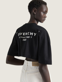 - Short-sleeved t-shirt in cotton. - Crew neck. - GIVENCHY Stamp printed on the chest and on the back. - Bias seams for a cocooning volume. - Cropped fit.