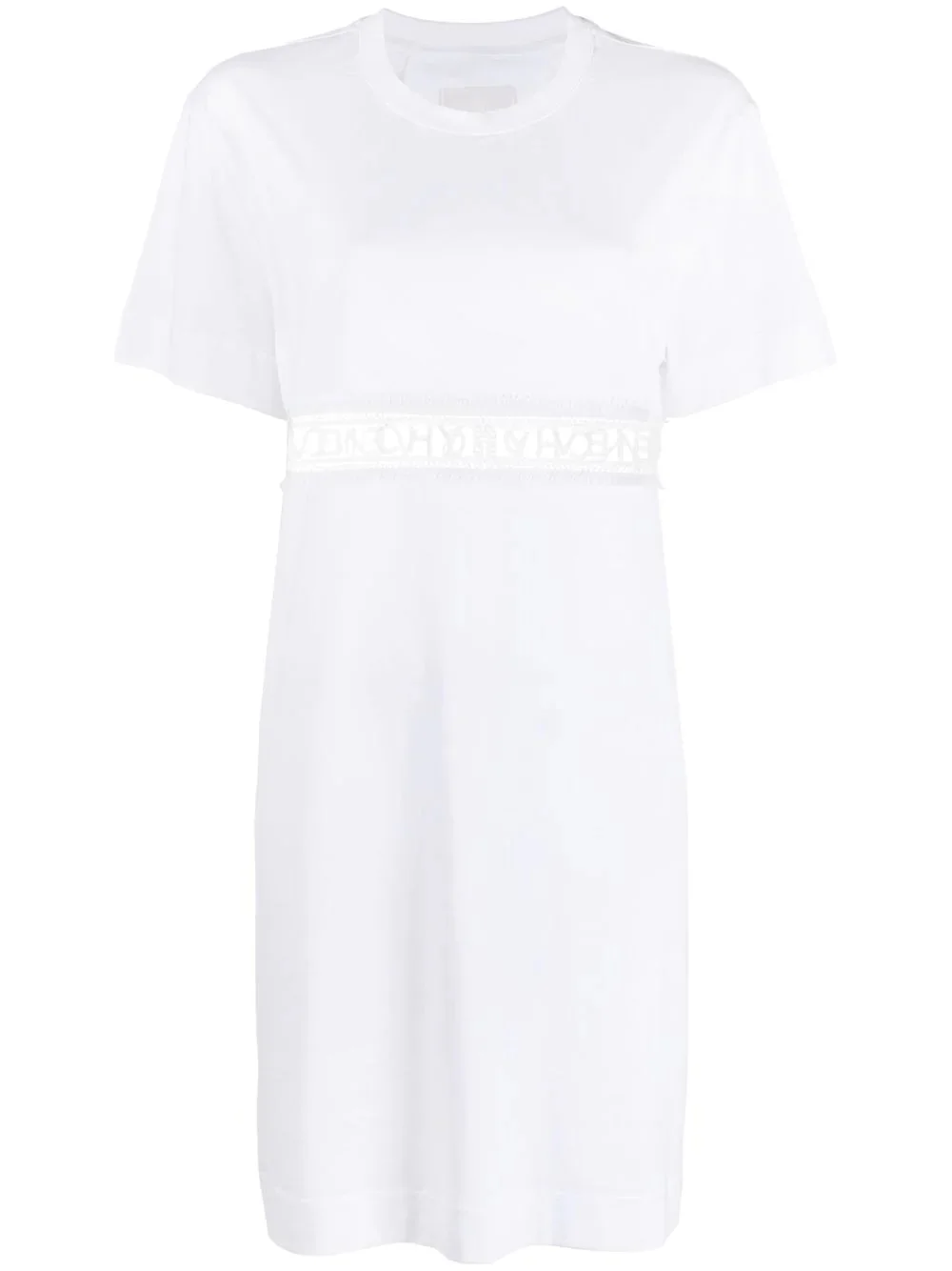 logo embroidered shift dress logo embroidered shift dress from GIVENCHY featuring white, cotton, embroidered logo, shift style, crew neck and short sleeves. Imported Composition Cotton 100%, Viscose 77%, Polyamide 23% Washing instructions Machine Wash
