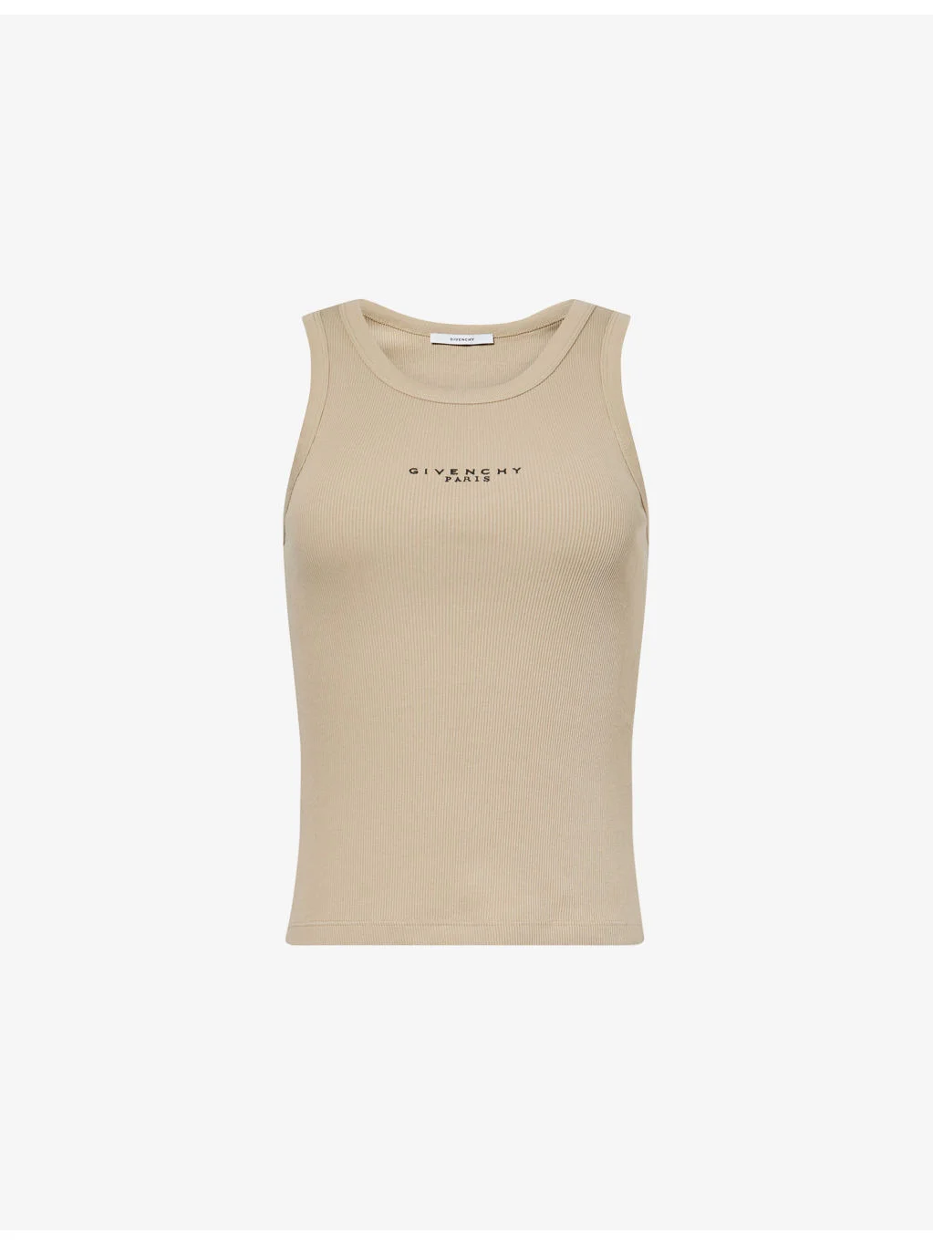 PRODUCT DETAILS - Givenchy cotton tank top - 98% cotton, 2% elastane - Close fit, scoop neck, sleeveless, logo print at front, all-over stretch-rib - Machine wash at 30°C - Made in Portugal - True to size - Model is 5ft 10in/1.78m and wears a size small - Lightweight, stretchy Ref: R04557409
